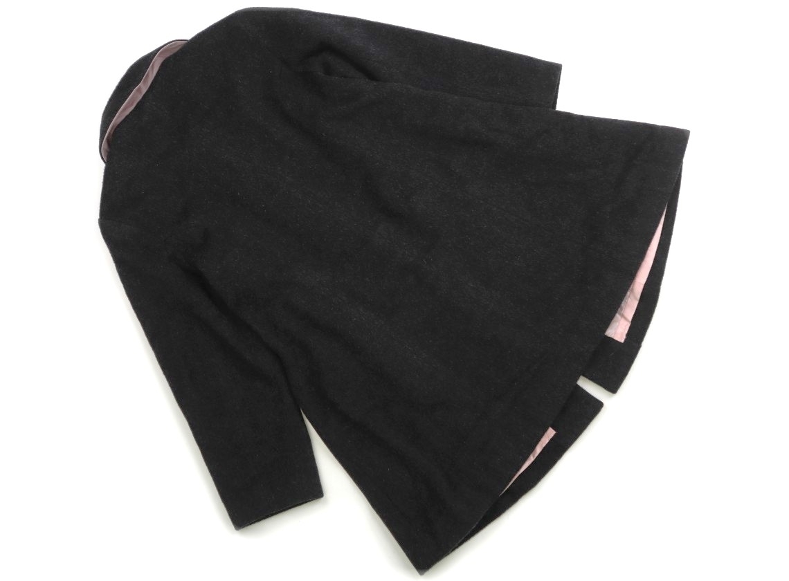 モヘヤ、カシミヤ、アンゴラ混ナイロンウール生地。裏地はポリエステル。付属の衿ファーは欠損しています。右袖に茶色い汚れ、全体にヨレ感ありますがまだまだお使いいただけそうです。