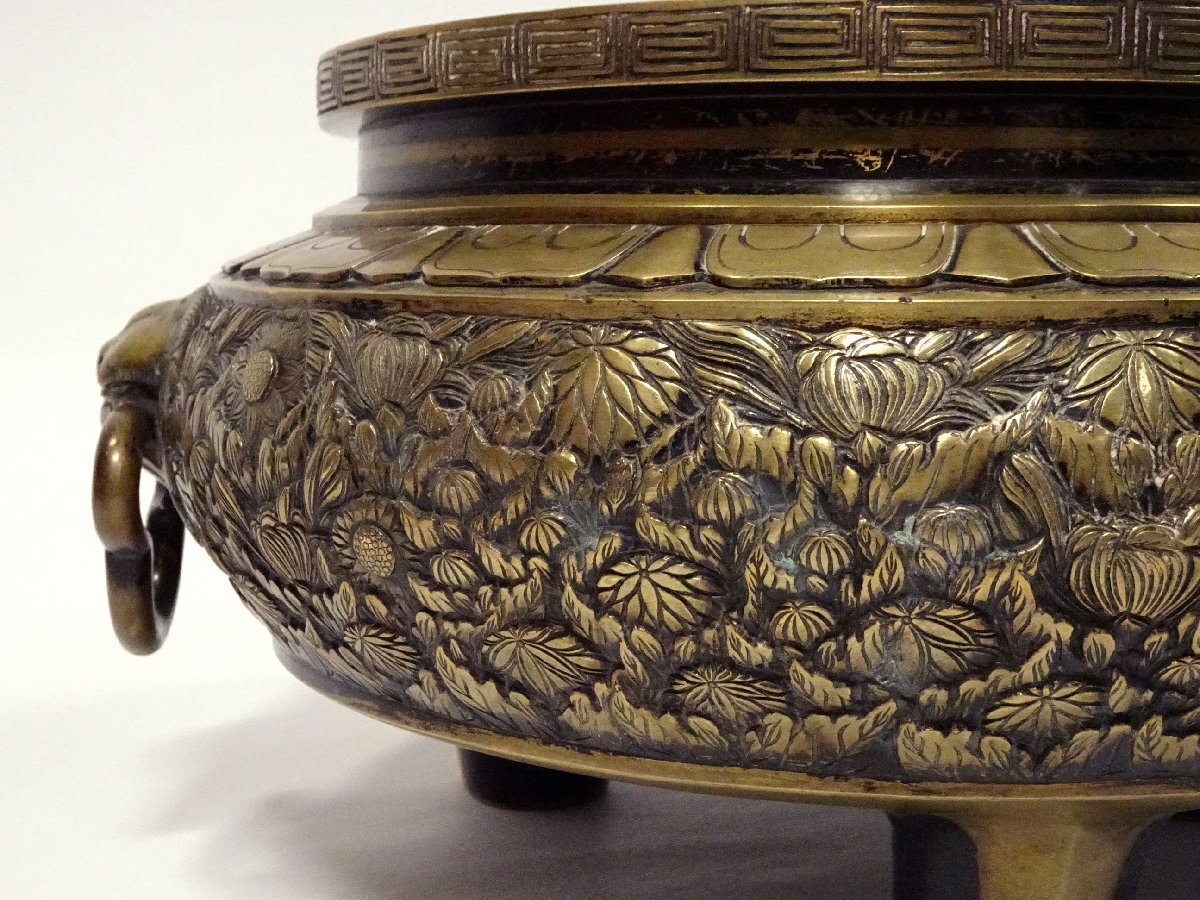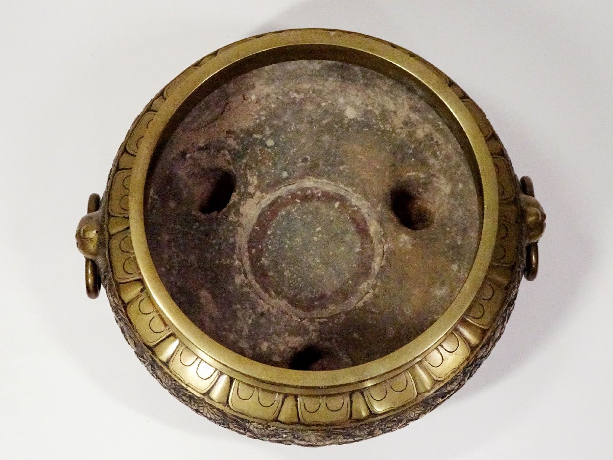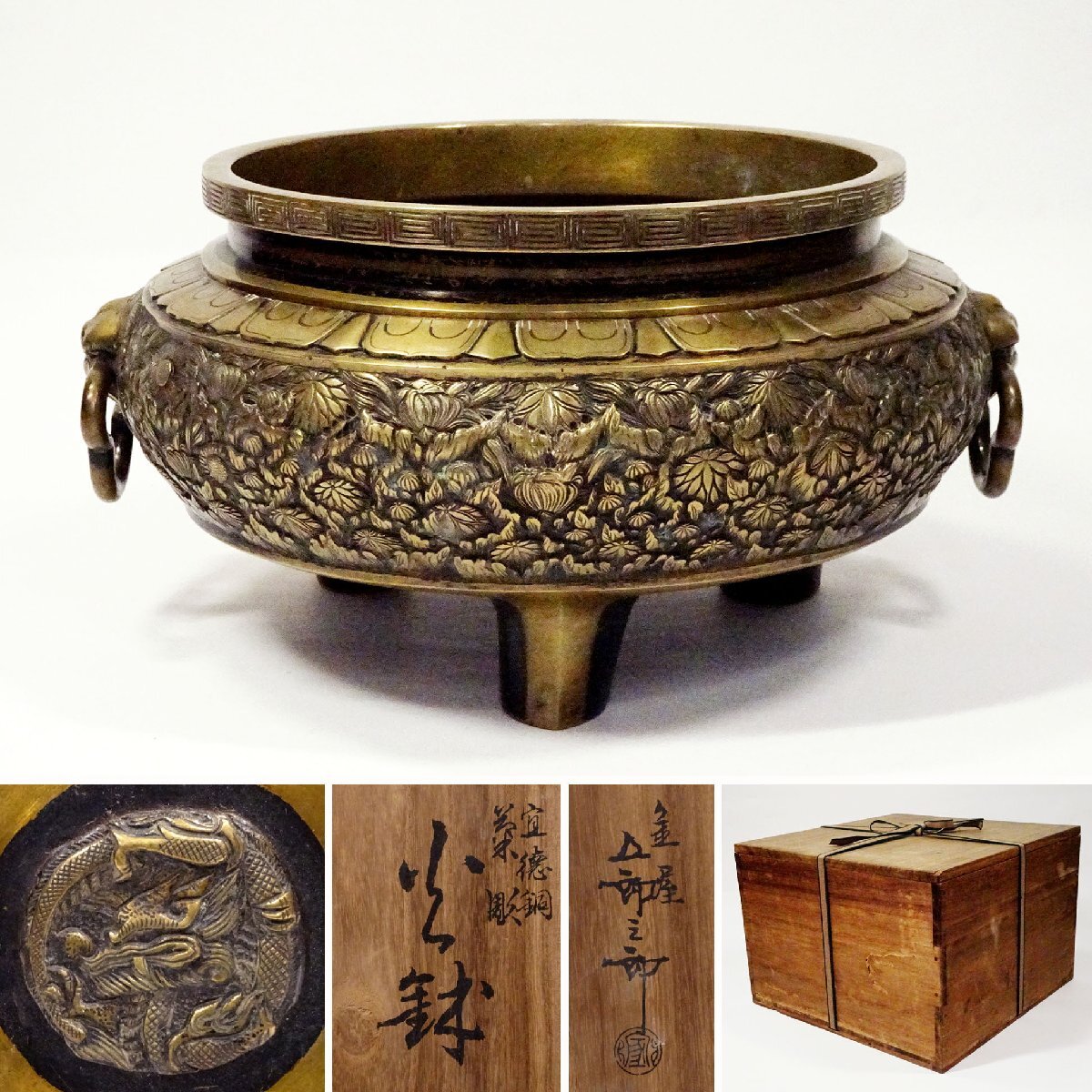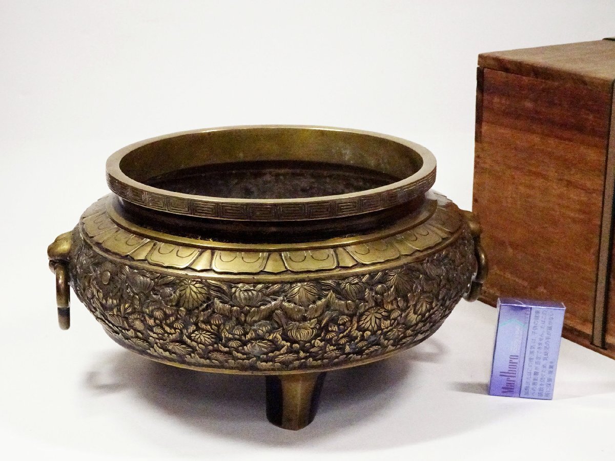 素晴らしい、金工家【金屋五郎三郎】造 宣徳銅 菊彫 双耳 火鉢 瓶掛です。    宣徳銅造りに、極上細密彫細工で菊花が表現された見事な火鉢です。    美しい容姿はもちろんのこと、美しい肌、高い意匠が感じられる造りの素晴らしいお品です。    細部に至るまでこだわり抜かれたお品です。    底部には「金屋五郎三郎」の龍印もきちんとございます。       経年を経て生まれた深みある風合いからは圧倒的な風格、そして姿からは品格の高さが感じられます。     画像でもご確認出来ますように、僅かな擦れ・汚れ・変色は見られますが、その他、大きな傷みもなく、素晴らしい逸品となっております。   共箱付き    是非、ご注目下さい!
