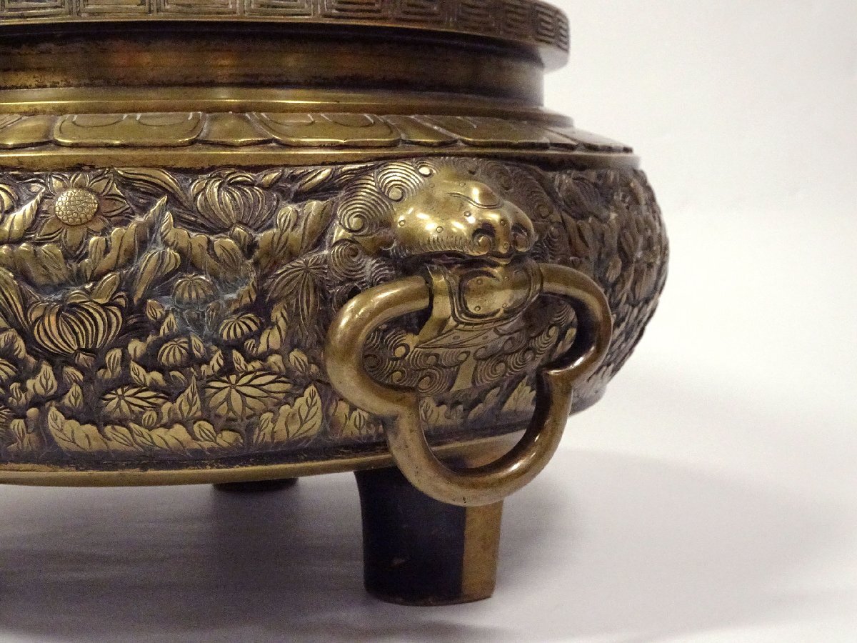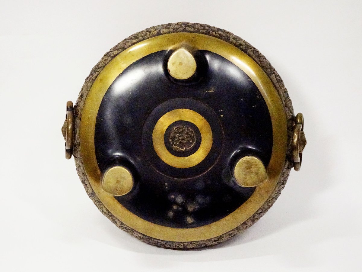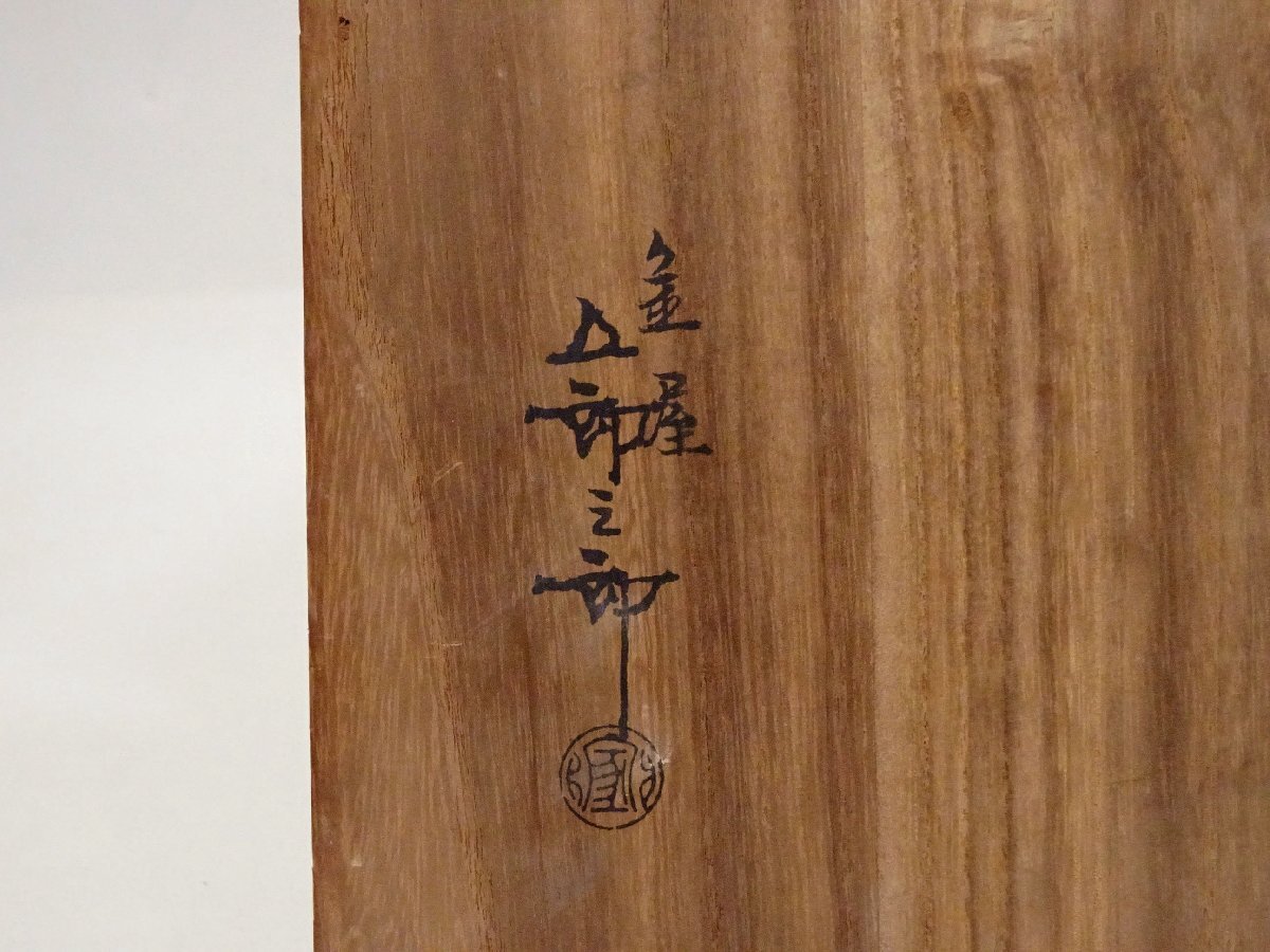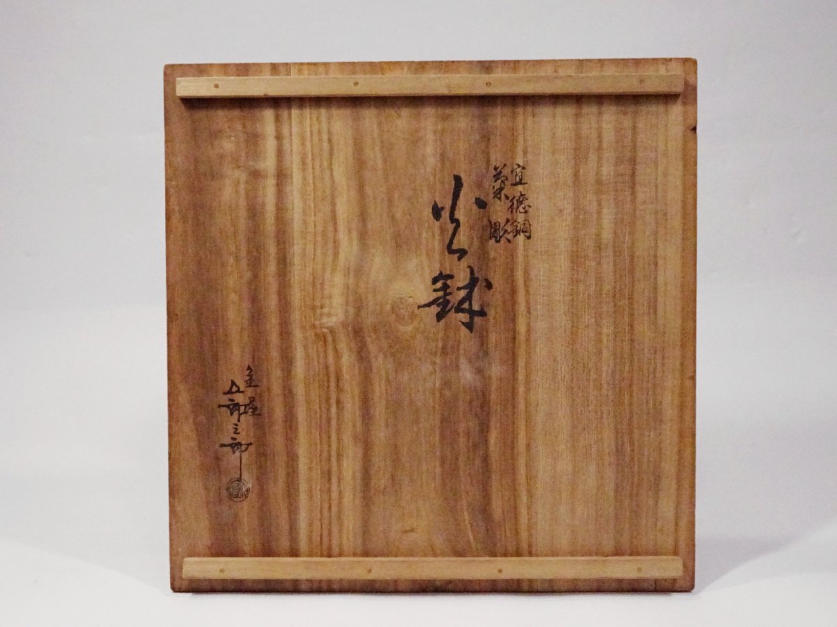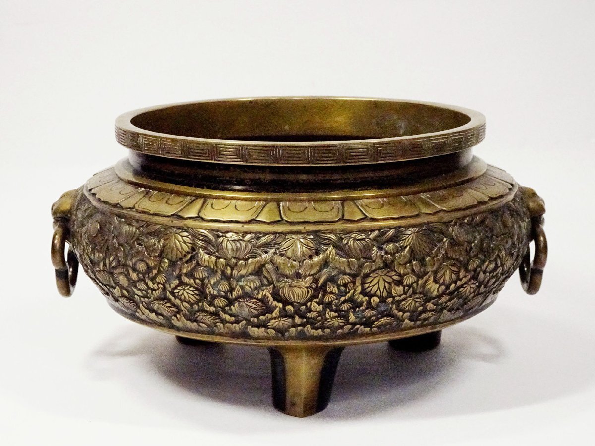 素晴らしい、金工家【金屋五郎三郎】造 宣徳銅 菊彫 双耳 火鉢 瓶掛です。    宣徳銅造りに、極上細密彫細工で菊花が表現された見事な火鉢です。    美しい容姿はもちろんのこと、美しい肌、高い意匠が感じられる造りの素晴らしいお品です。    細部に至るまでこだわり抜かれたお品です。    底部には「金屋五郎三郎」の龍印もきちんとございます。       経年を経て生まれた深みある風合いからは圧倒的な風格、そして姿からは品格の高さが感じられます。     画像でもご確認出来ますように、僅かな擦れ・汚れ・変色は見られますが、その他、大きな傷みもなく、素晴らしい逸品となっております。   共箱付き    是非、ご注目下さい!