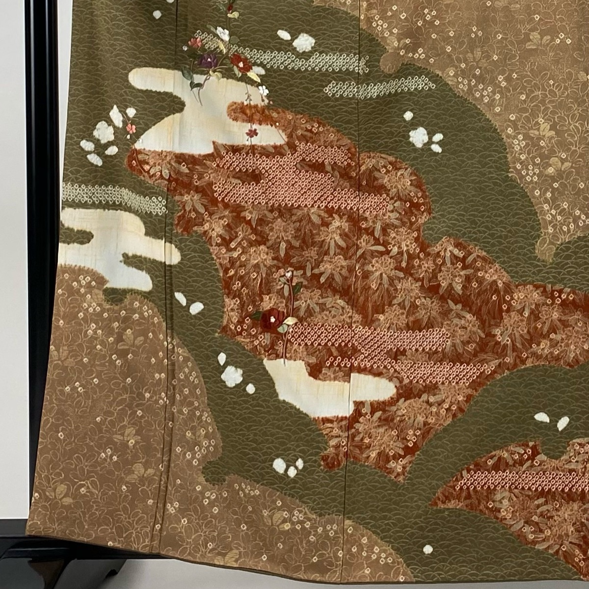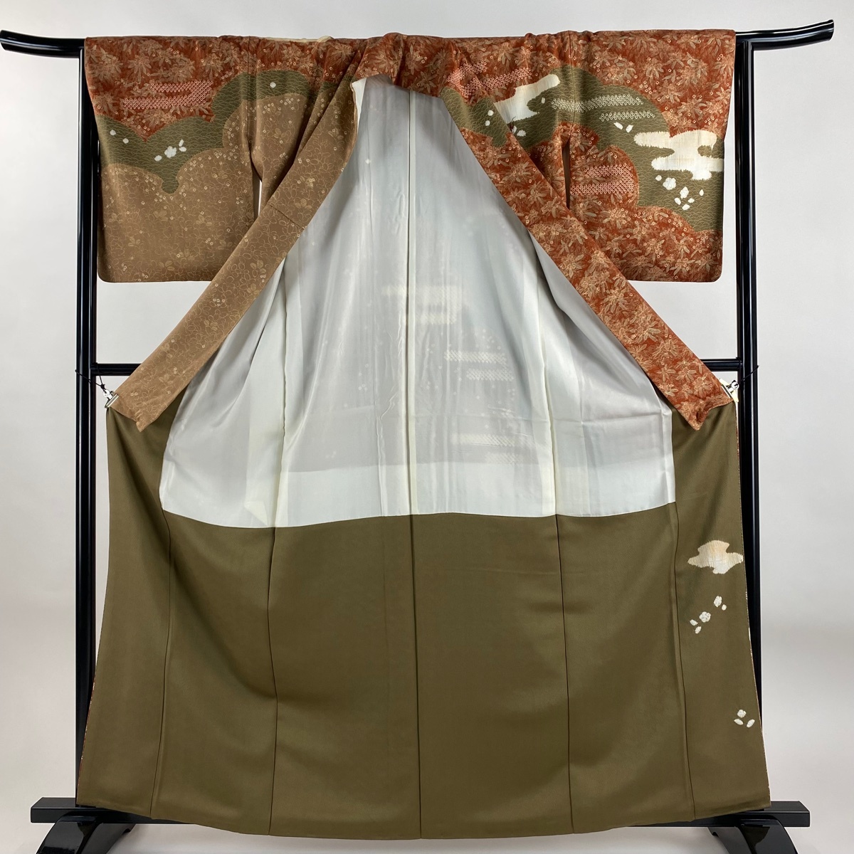 | 訪問着 美品 秀品 椿 ヱ霞 刺繍 絞り 赤茶 袷 身丈161 裄丈64 M 正絹 【中古】 |