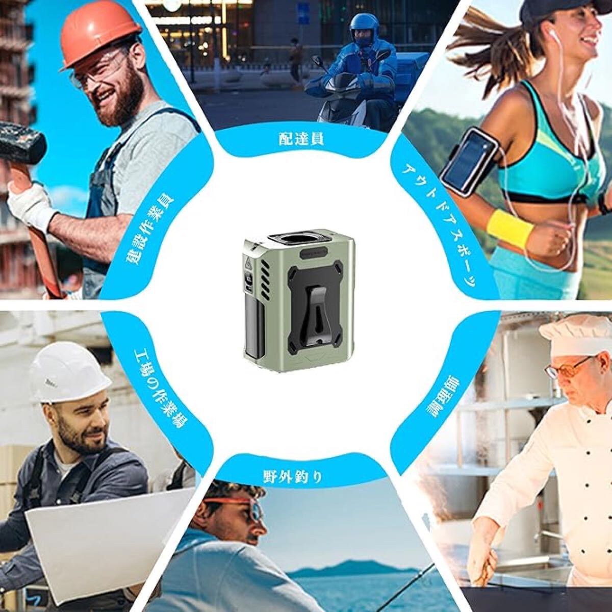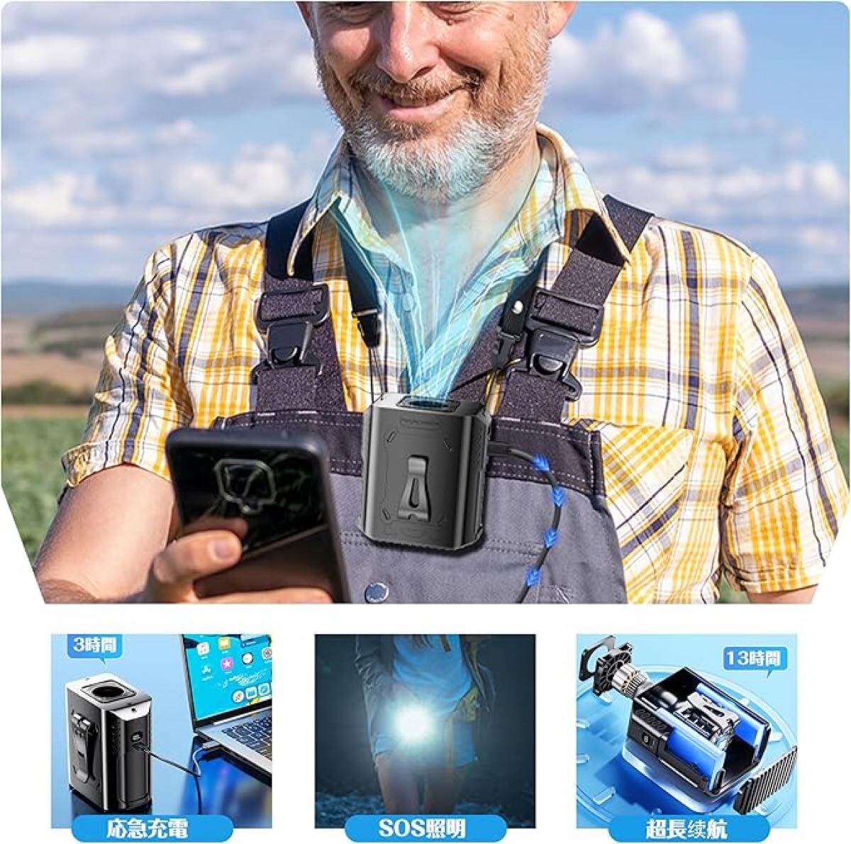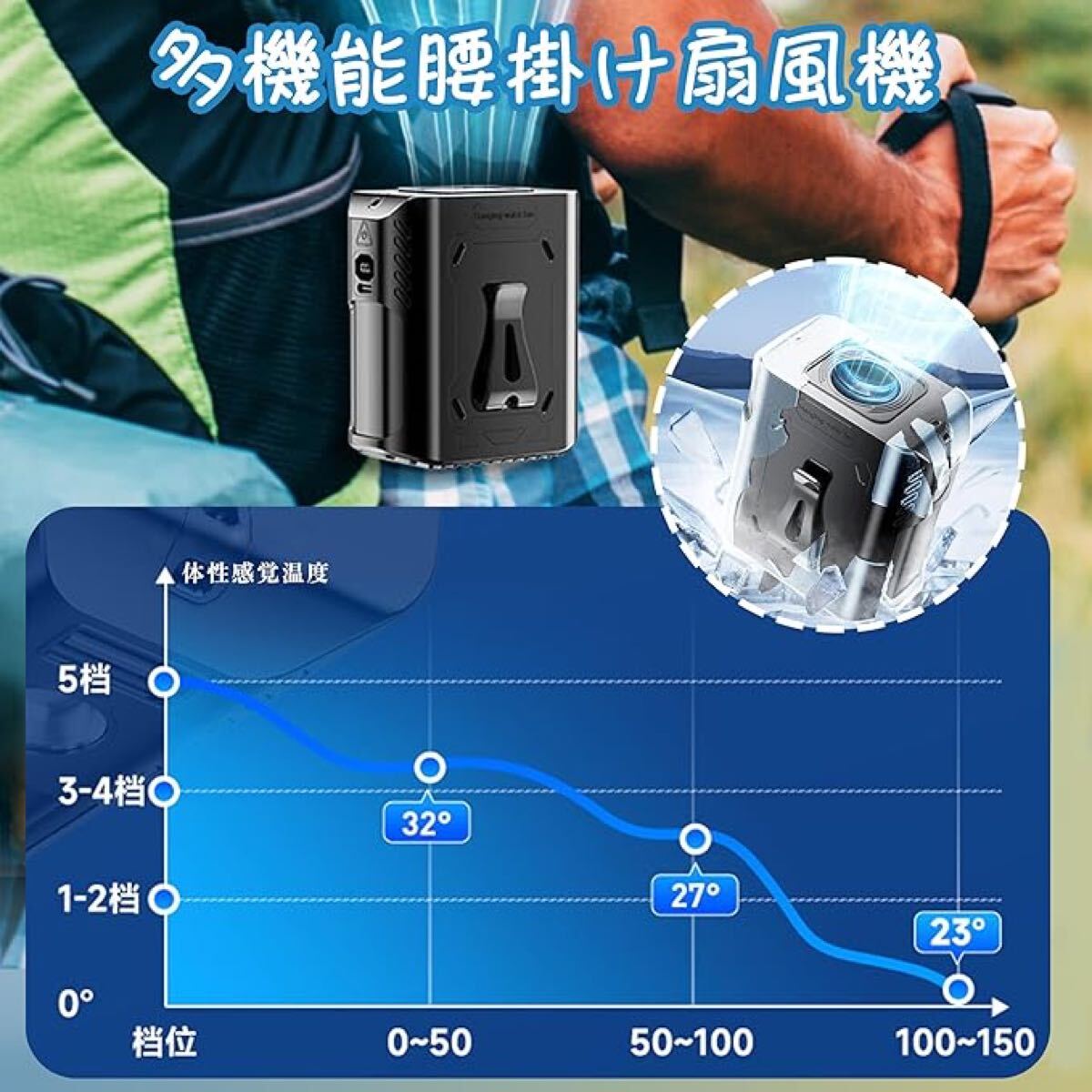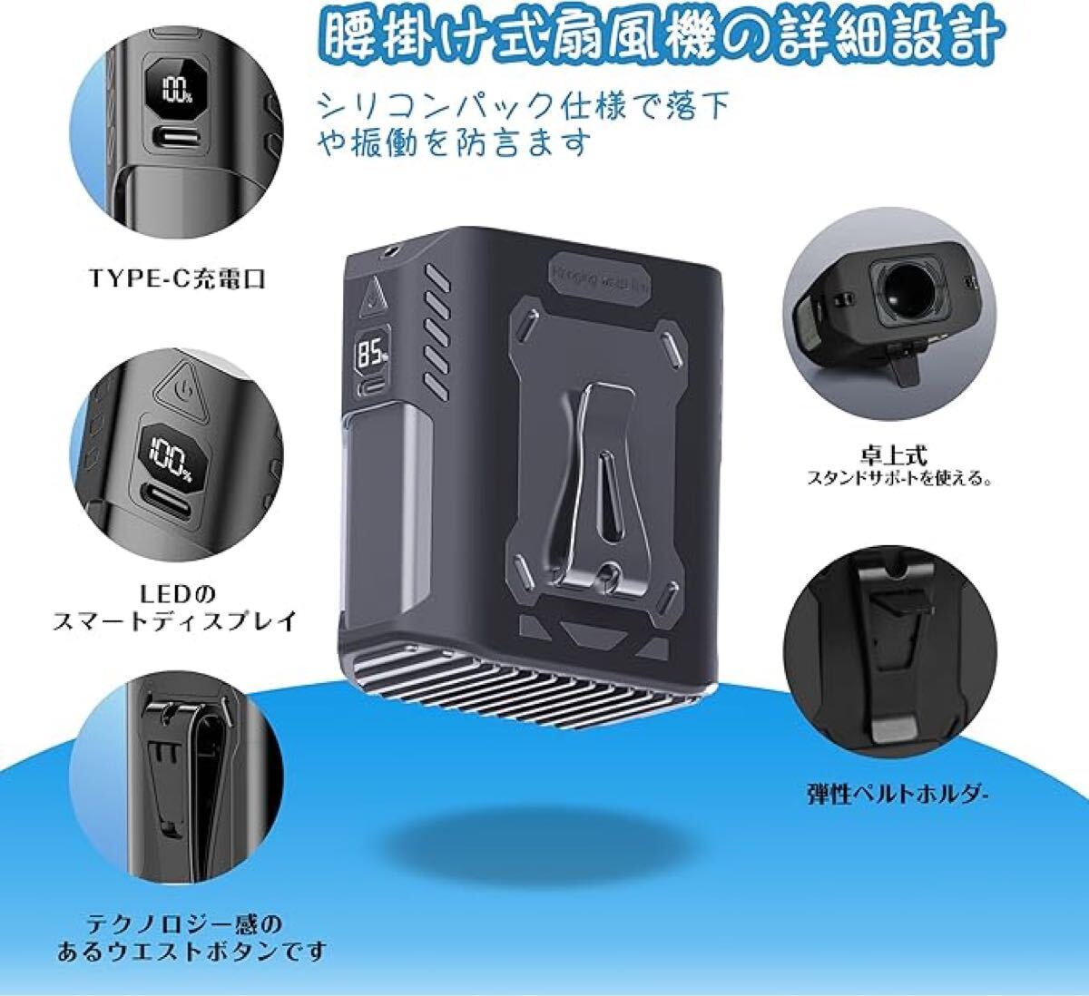 【5in1多機能ファン】:携帯性がありながら多機能です。ベルトやパンツに取り付けて体を冷やすためのウエストハンギングファンとして、また夏の旅行中に手を自由にするための首掛けファンとして使用することができます。さらに、LEDライト、SOSライト、デスクトップファン、ネックファンとしても使用することができます。