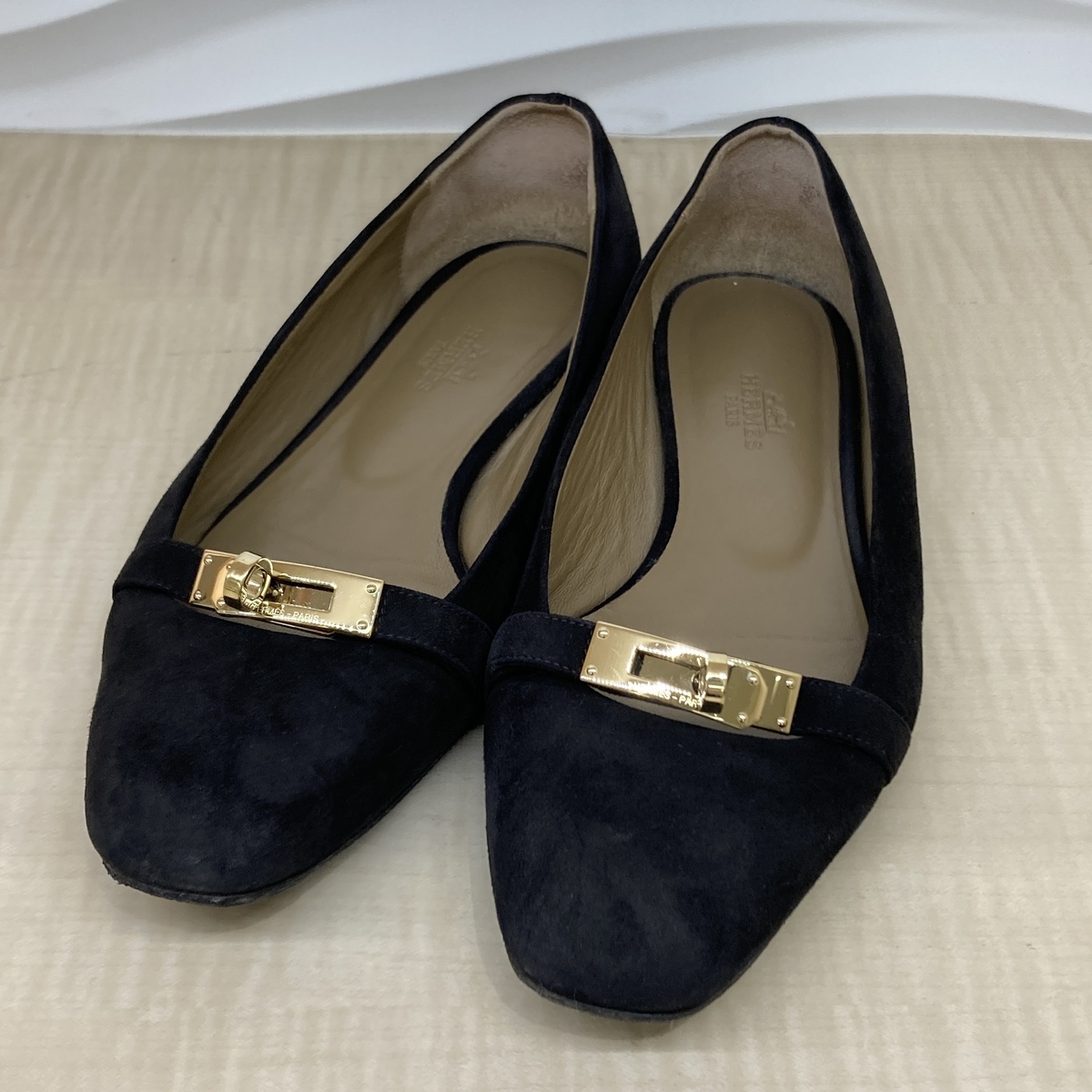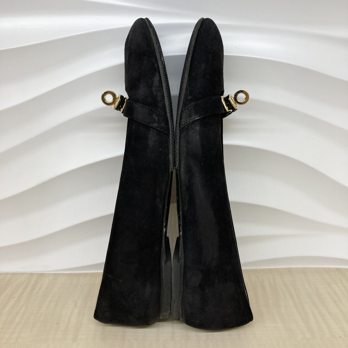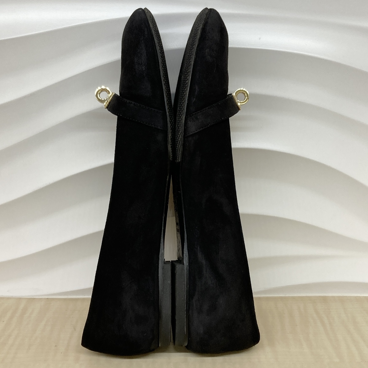 ブラックのスエードにゴールドのケリーバックルが印象的なフラットシューズ。 |