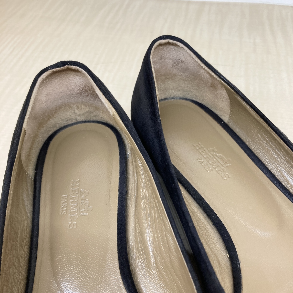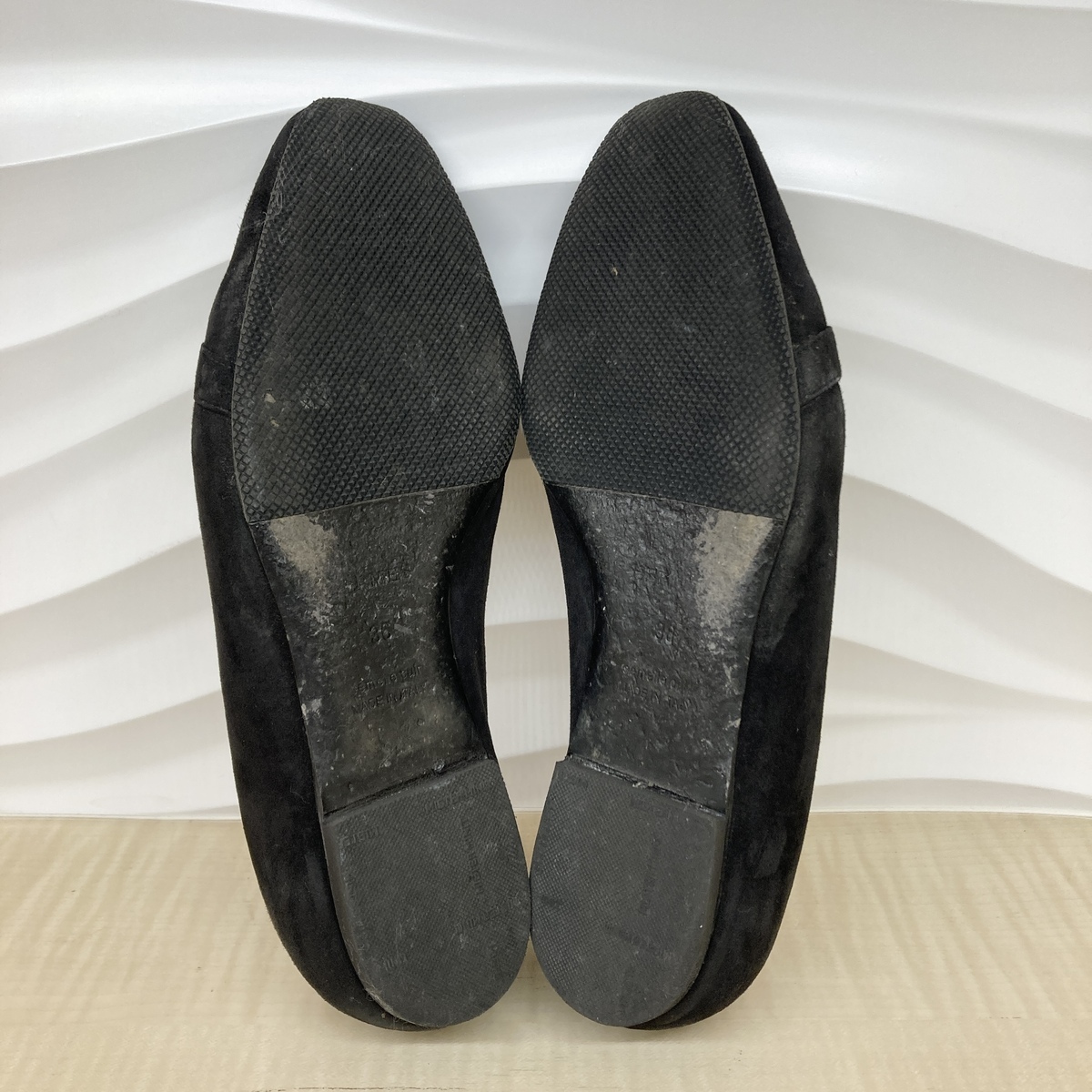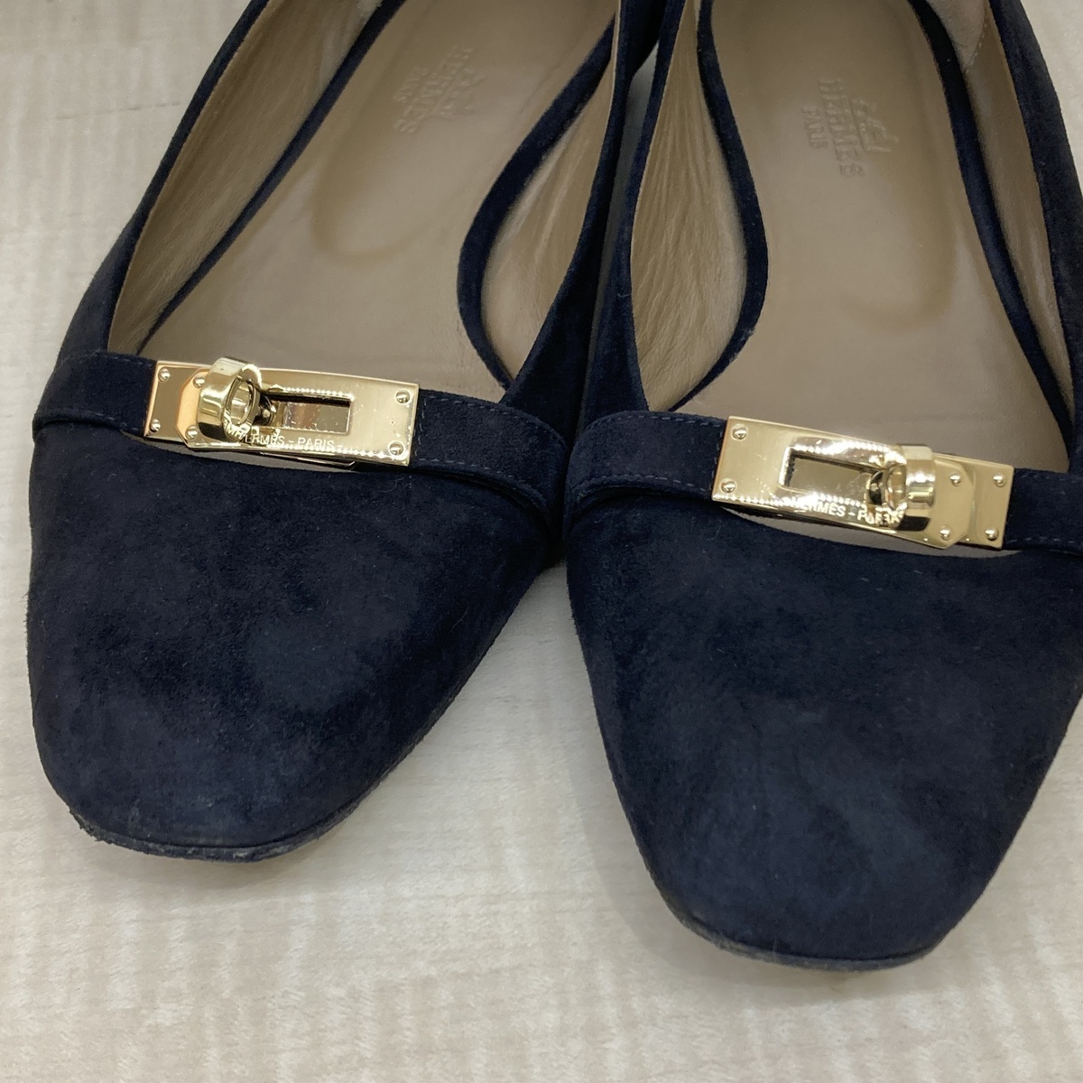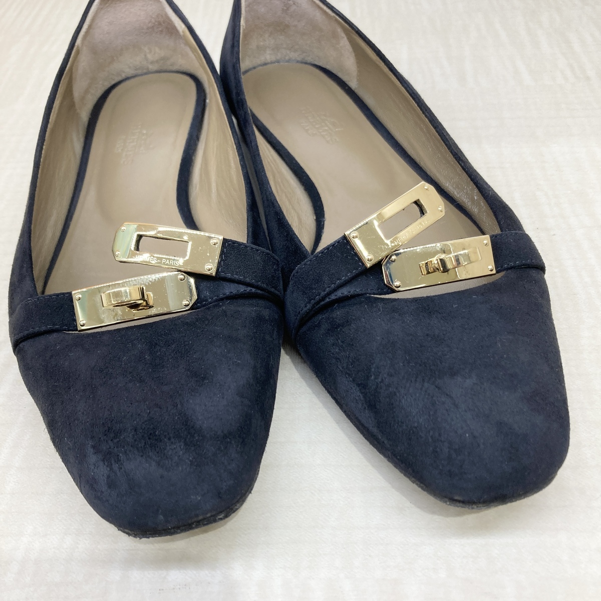 ブラックのスエードにゴールドのケリーバックルが印象的なフラットシューズ。 |