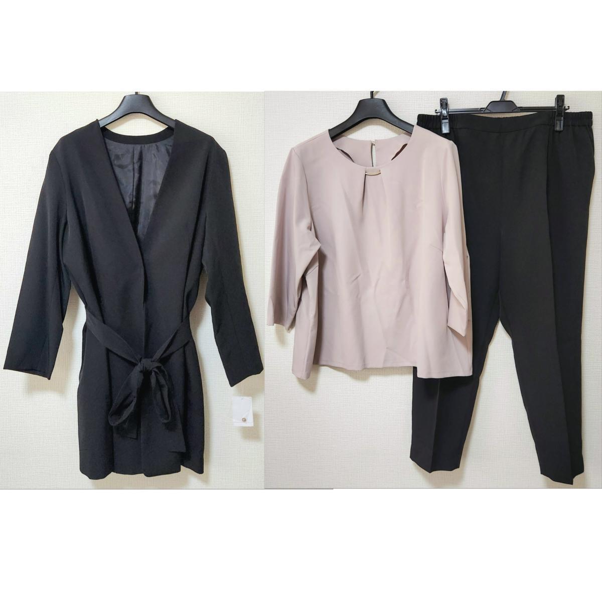 ロング丈 ノーカラーコートジャケット、ブラウス、テーパードパンツの3点セットです