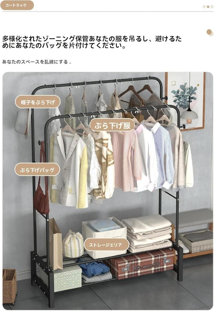 【多機能収納】FANISA のハンガーラックはコートや洋服などをかける、帽子やカバンなどをかける、さらには収納ケース、靴、カバン、タオル、布団や小物を置くことも可能です。大幅にあなたの狭い部屋にスペースを省けます!