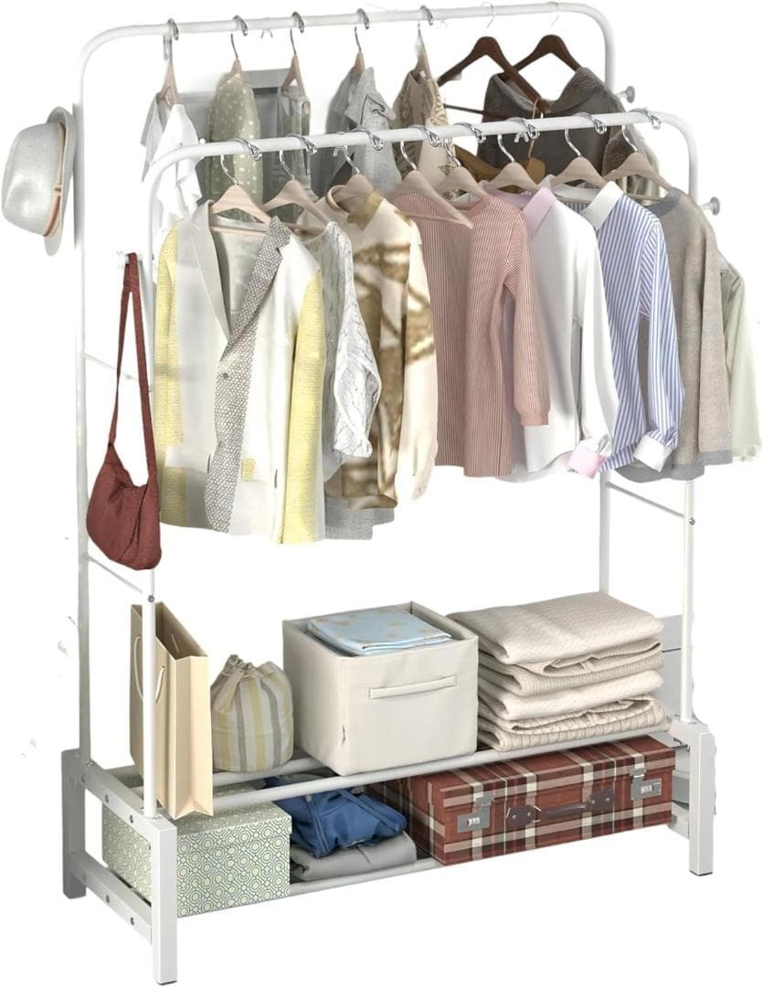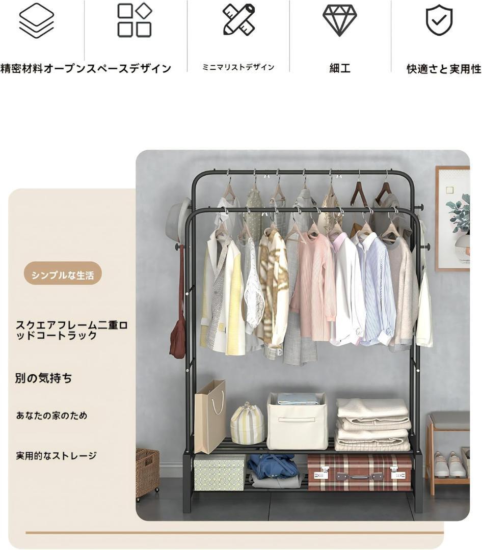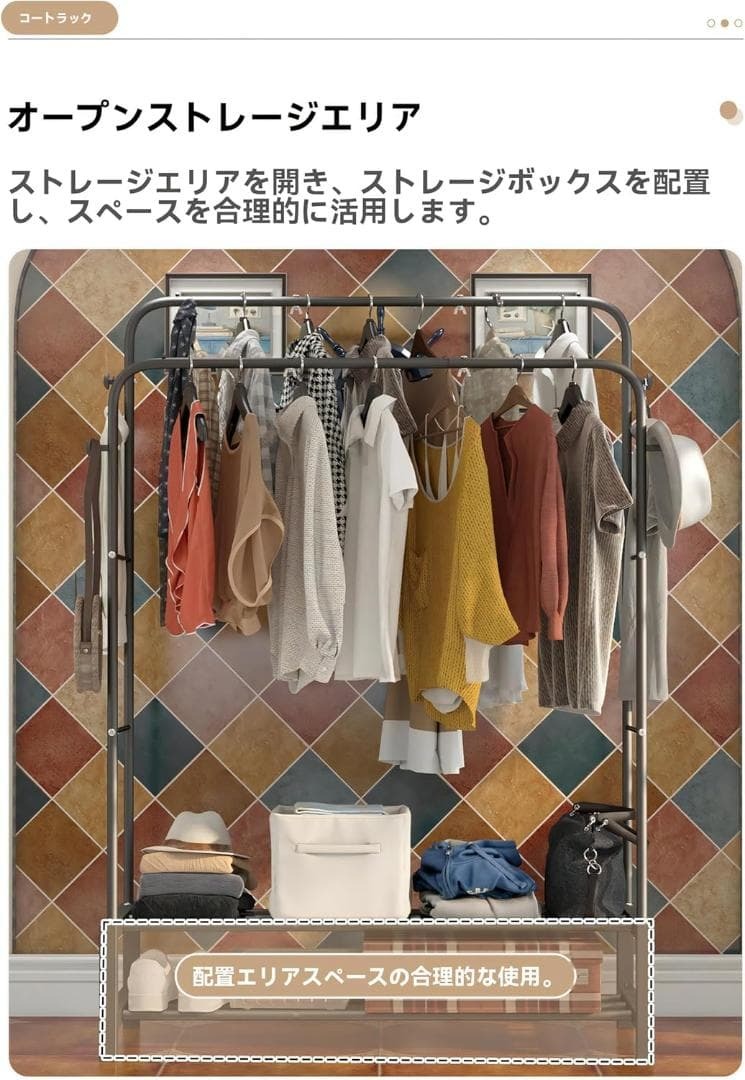 【うまく設計された】パイプハンガーラック は一番下と側面5段のメッシュ棚のデザインは、スチール製で通気性が良く、収納ケース、靴、バッグ、タオル、薄い布団や小物なども楽々置けます。重さのかかるコートなども安心です。水分を含んだ重い衣類をかけることもできます。