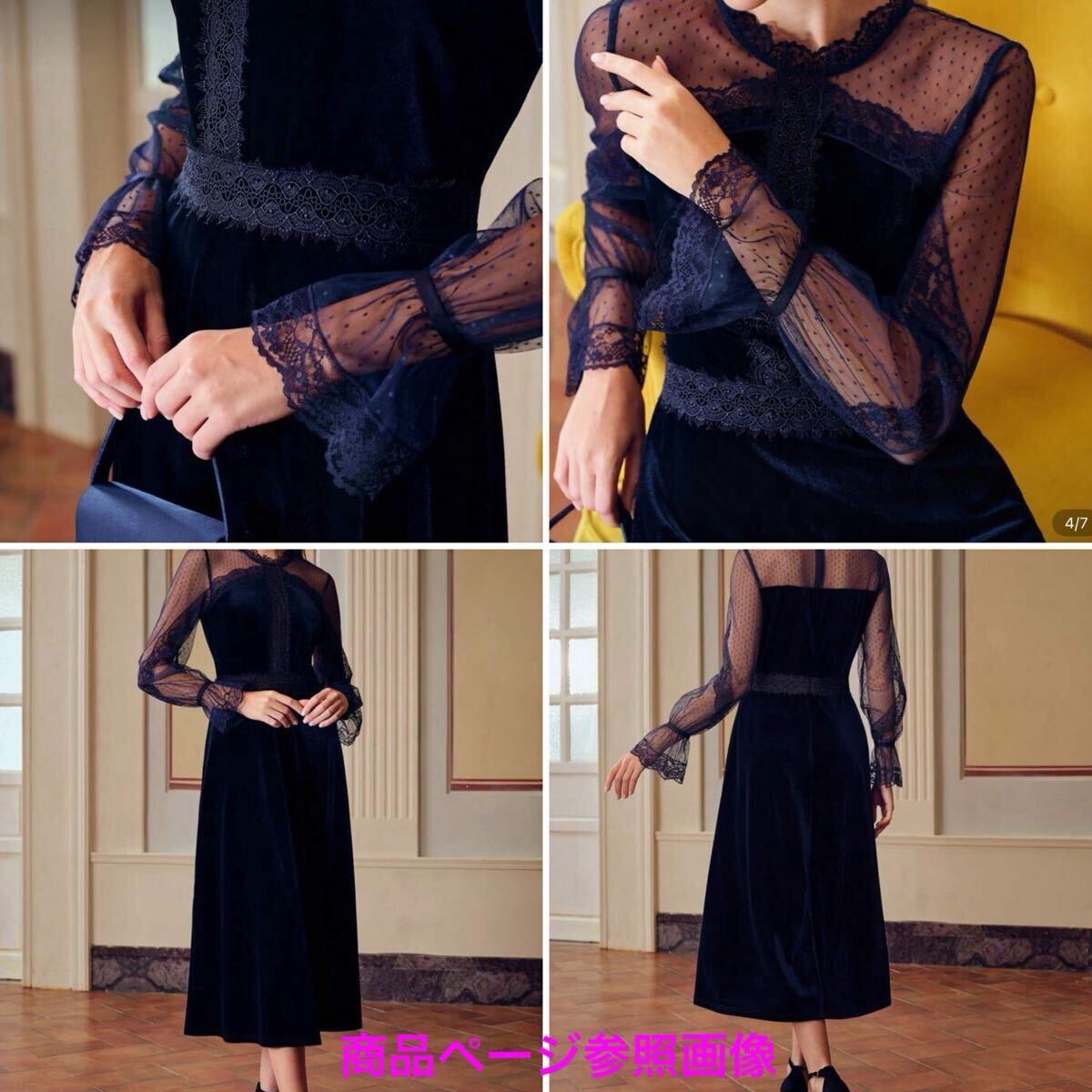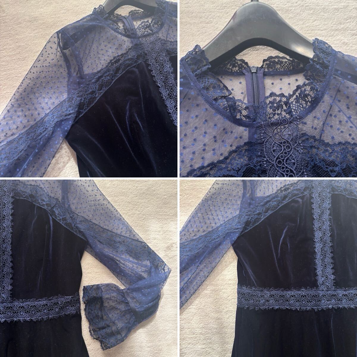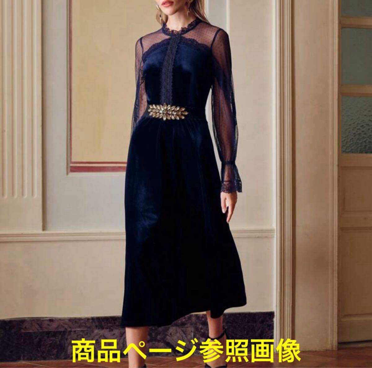 ドレス ワンピース パーティードレス フォーマルドレス 結婚式 披露宴 二次会 ネイビー レース 秋 冬 ベロア フォーマル