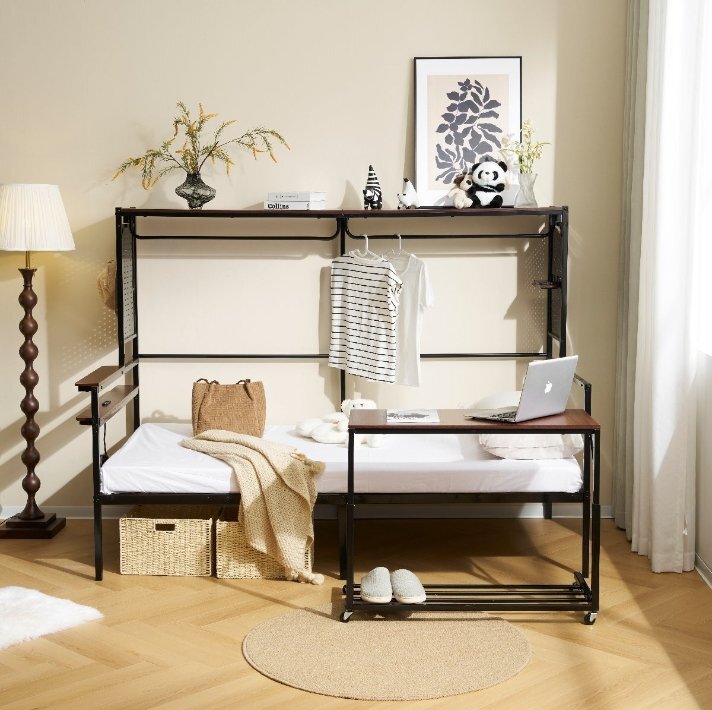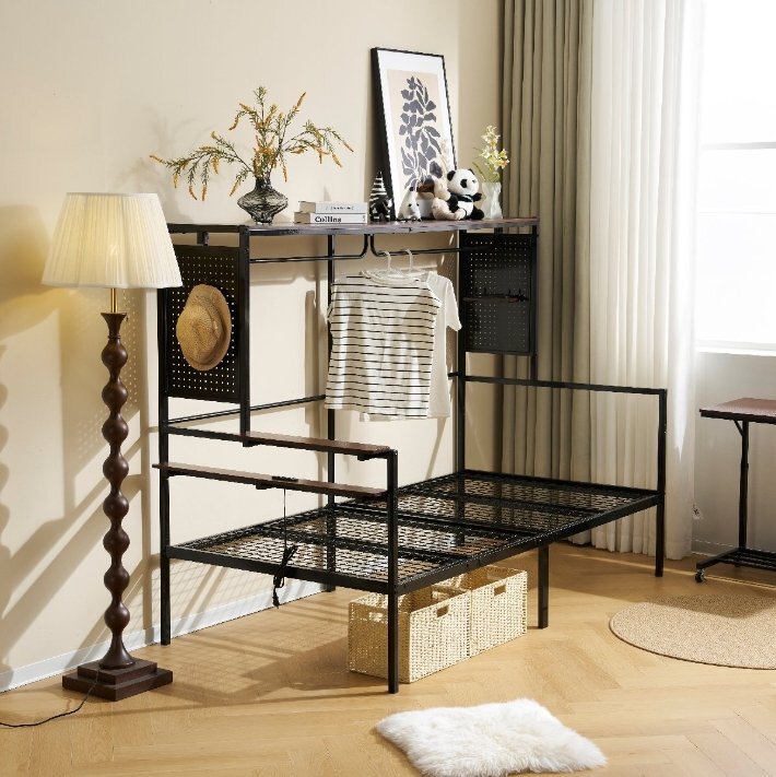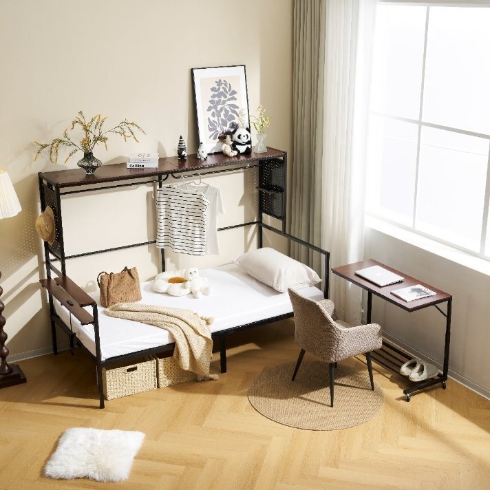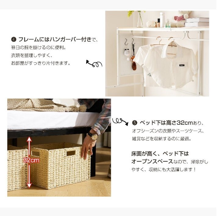 • 【たっぷりの収納スペース】充実した収納スペースを備えており、お部屋をすっきり整理整頓できる。1.左側には2段の収納棚があり、目覚まし時計やティッシュなど、日常でよく使うアイテムを手軽に置くことができます。充実した収納スペースを備えており、お部屋をすっきり整理整頓できる。1.左側には2段の収納棚があり、目覚まし時計やティッシュなど、日常でよく使うアイテムを手軽に置くことができます。2.ベッドの両サイドには有孔ボードを搭載。小物やインテリアを自由に飾れるので、男女問わず自分好みにカスタマイズ可能!3.ベッド上部にはワイドな収納ラックがあり、本や雑貨を広々と快適に置くことができます。4.フレームにはハンガーバー付きで、翌日の服を掛けるのに便利。衣類を整理しやすく、お部屋がすっきり片付きます。