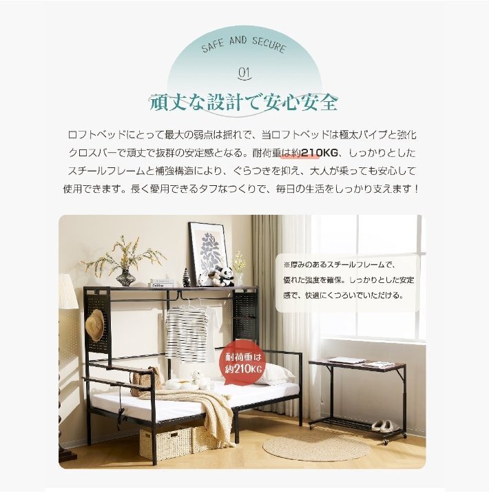 • 【頑丈な設計で安心安全】ロフトベッドにとって最大の弱点は揺れで、当ロフトベッドは極太パイプと強化クロスバーで頑丈で抜群の安定感となる。耐荷重は約210kg、しっかりとしたスチールフレームと補強構造により、ぐらつきを抑え、大人が乗っても安心して使用できます。長く愛用できるタフなつくりで、毎日の生活をしっかり支えます!