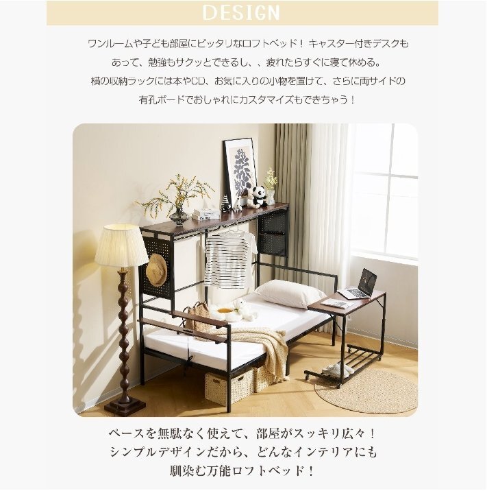 • 【1台で3役こなす、自由度アップ】ワンルームや子ども部屋に最適なロフトベッド!デスク付きで勉強もはかどり、疲れたらすぐ休める便利さ。横の収納ラックで本や小物を整理でき、両サイドの有孔ボードでおしゃれにアレンジできるのが魅力です。