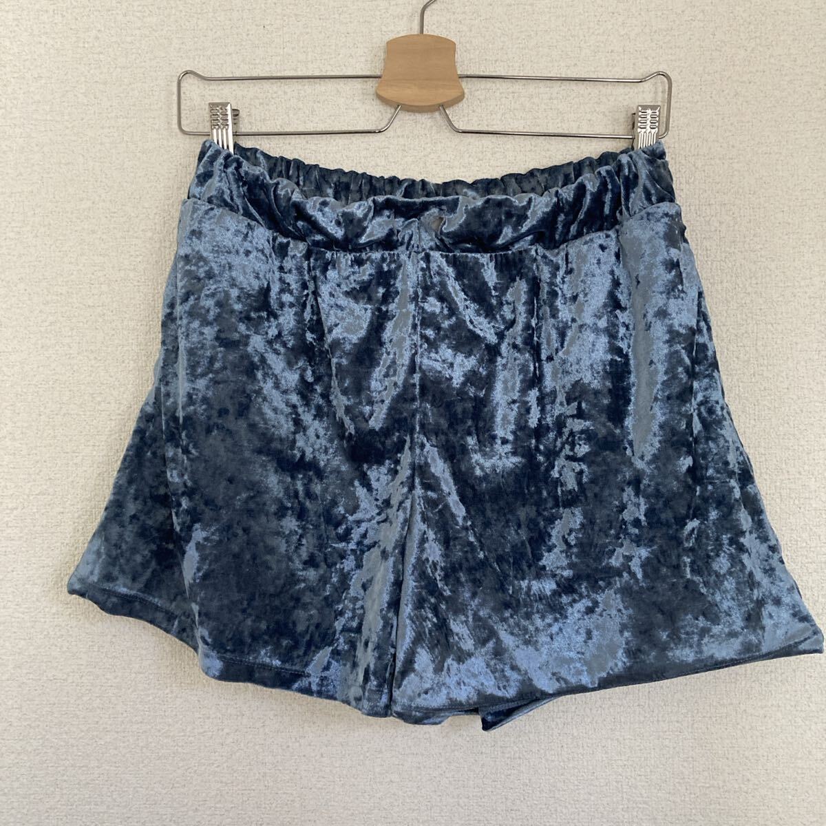 ダークブルーの柔らかいベロア素材のショートパンツ、快適なウエストゴム付き。