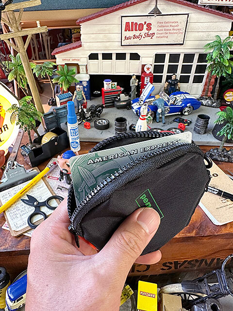 ちなみにクレジットカードも縦向きにちょうど入るようになってます。(中のポケットはどちら側も中で分割されてなくて、丸型なのでいっぱいいっぱい使えます)