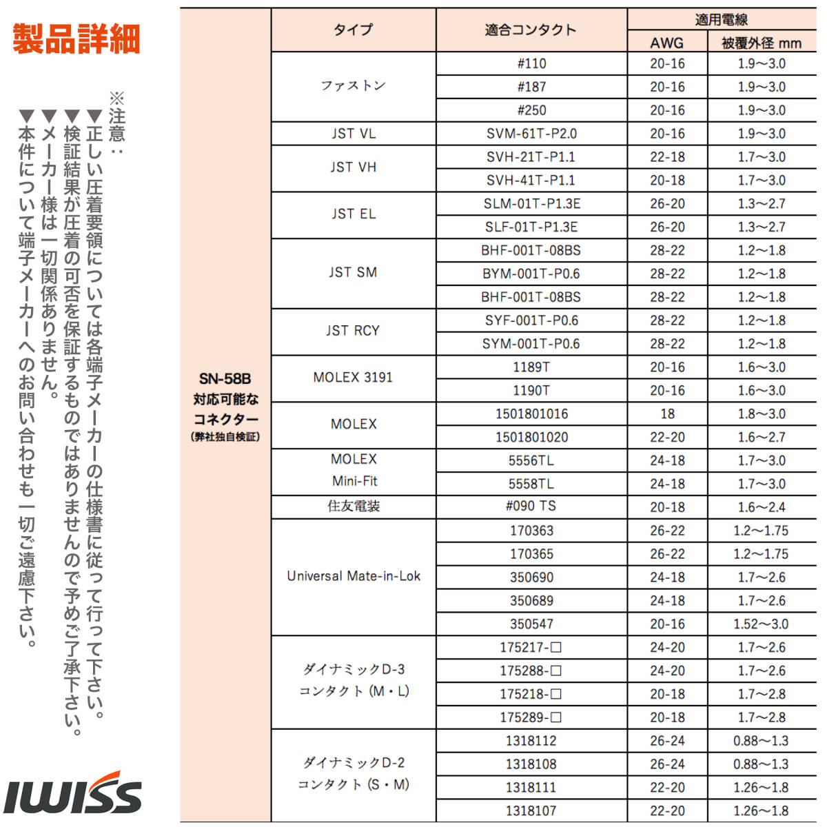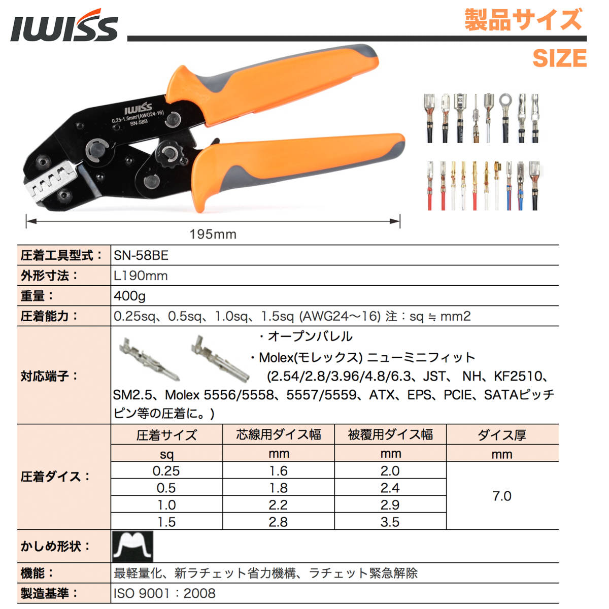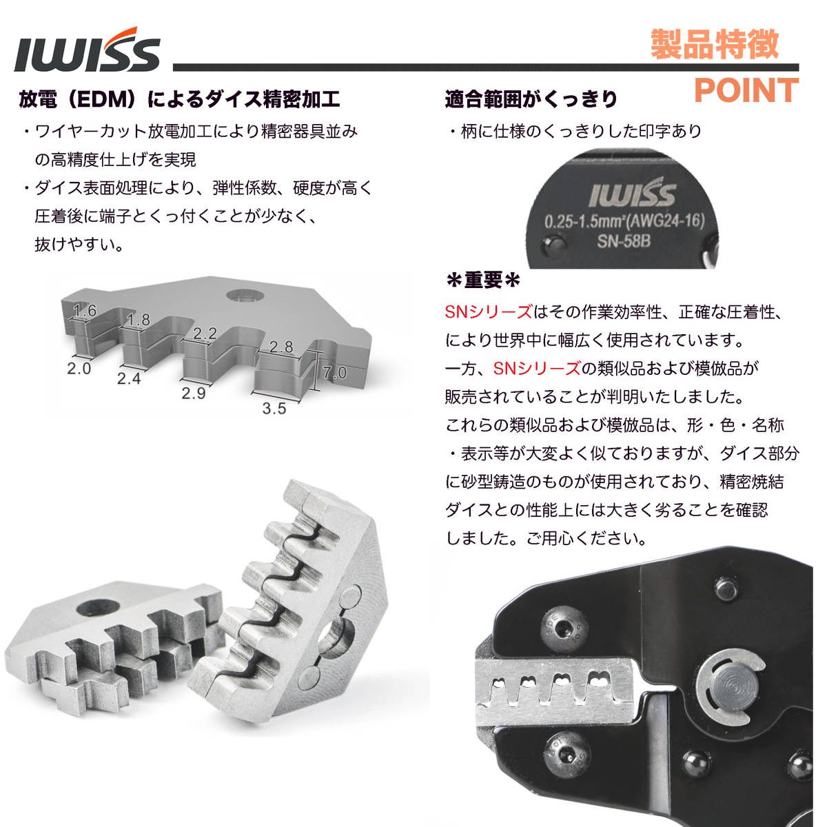 ★アイウィス(IWISS)★精密同時圧着ペンチ ラチェット式 オープンバレル端子 EDMカット品 0.25〜1.5mm2小・中型端子対応 SN-58BE★ | |||