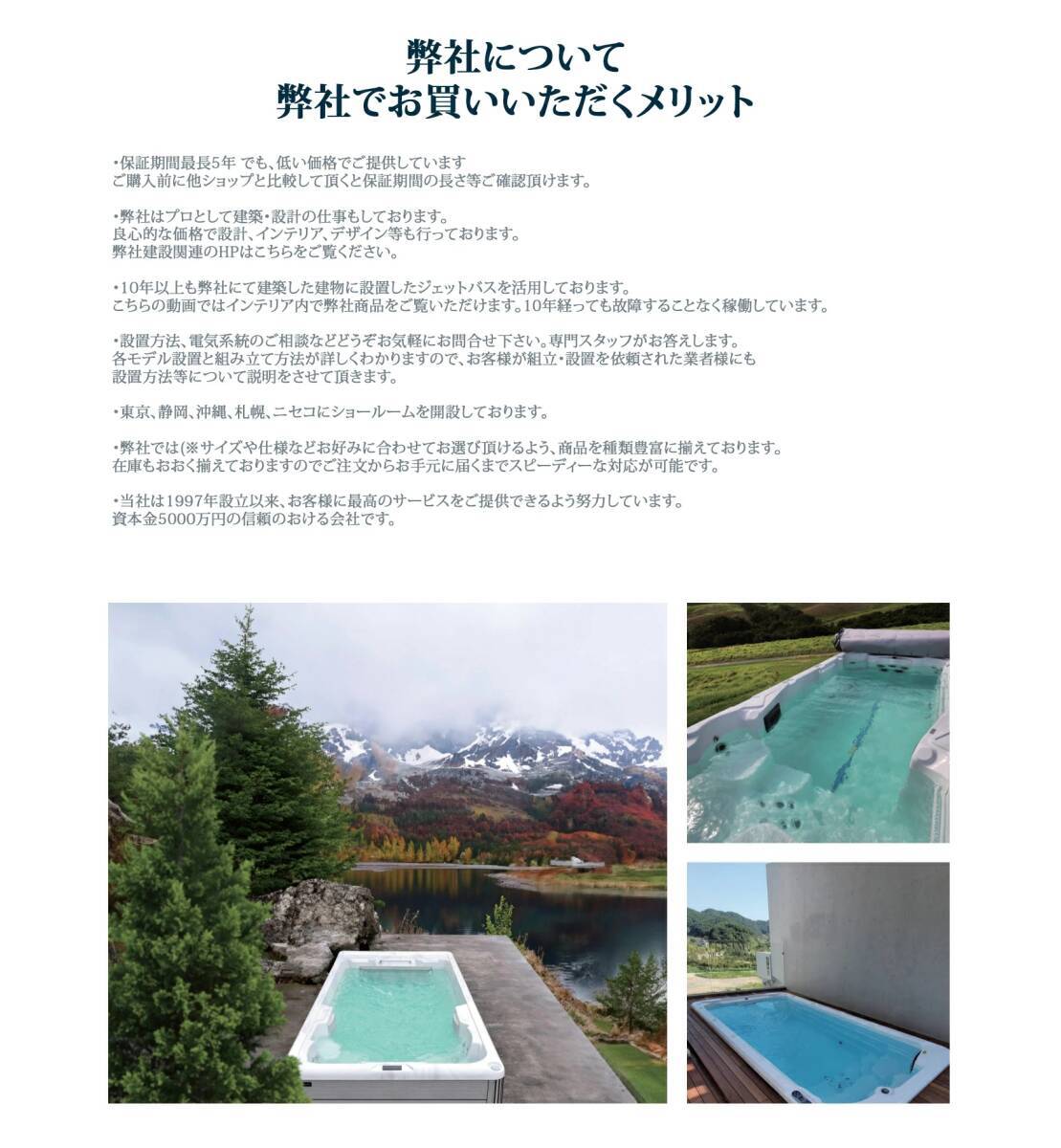 展示中のスパプールを東京ショールームでご覧いただけます。他の商品にも興味がある方は東京、静岡、沖縄、札幌、ニセコショールームへいらしてください。