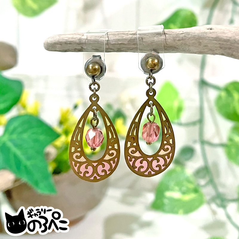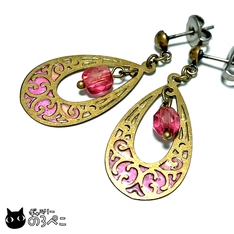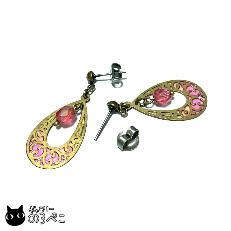 チェコビーズとステンドグラスみたいな透かしのピアス(オリエンタルなアンティーク風スタッドピアス・パープルピンク) bc804-89