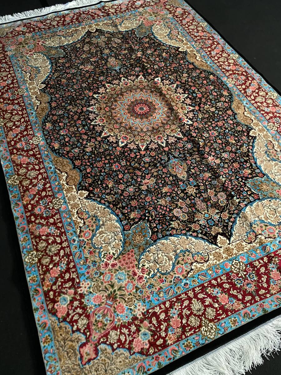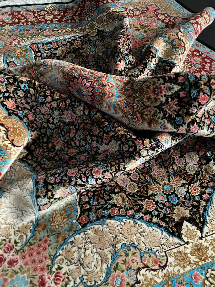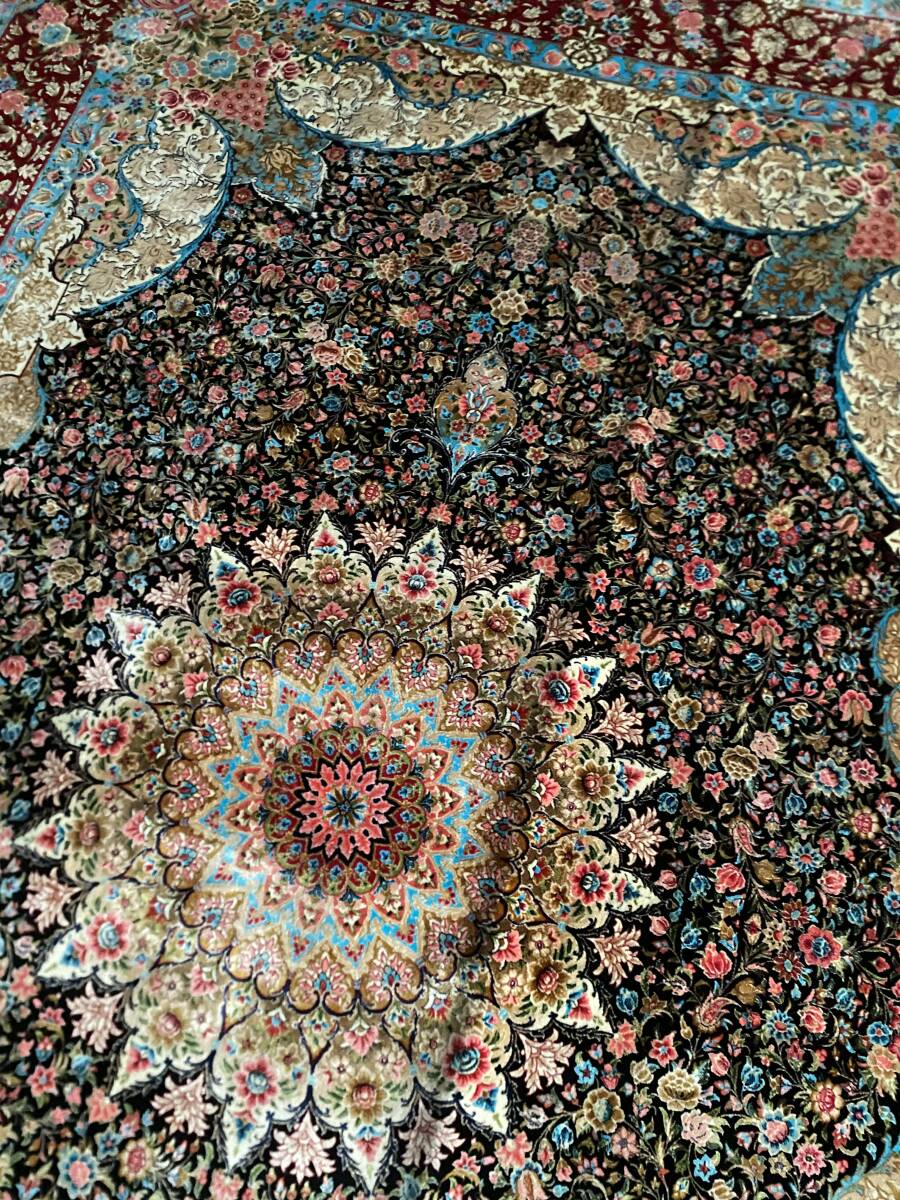 クム絨毯の歴史は1930年頃からと浅く、最初はウール絨毯を、後にシルク絨毯を織るようになりました。絹の産地としても有名なクムで、現在作られるほとんどの絨毯は100%シルク製です。