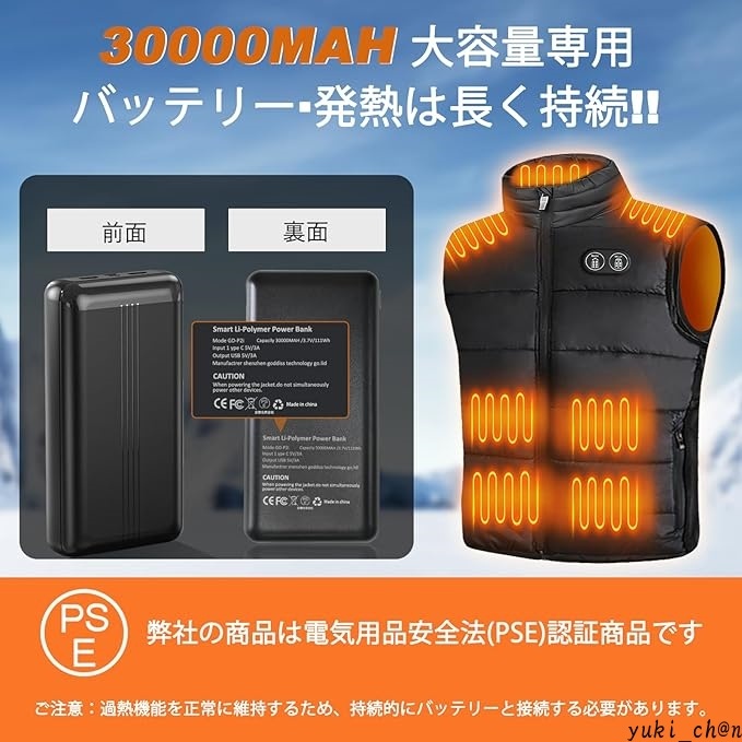 電熱ベスト 加熱ベスト ヒーターベスト XLサイズ 30000mAh大容量バッテリー付き 速暖 丸洗可 防寒ベスト 男女兼用 節電 省エネ