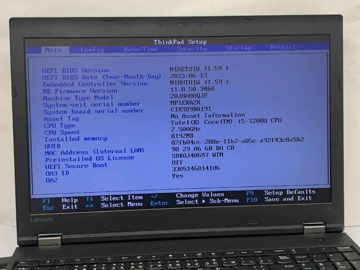 ジャンク/ LENOVO 20J8A00QJP ThinkPad L570 Intel Core i5-7200U メモリ8.19GB ストレージ無し 【K23466】