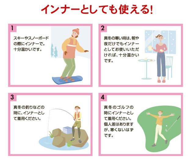 保温性に優れた素材ですので、普段着のインナーとしてもお使いいただけます。