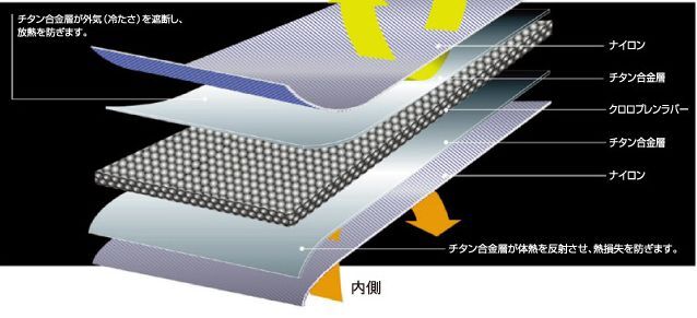 上図のようにチタン合金は、70ミクロンの超極薄のフイルム状で効果的な断熱、保温性を発揮し、