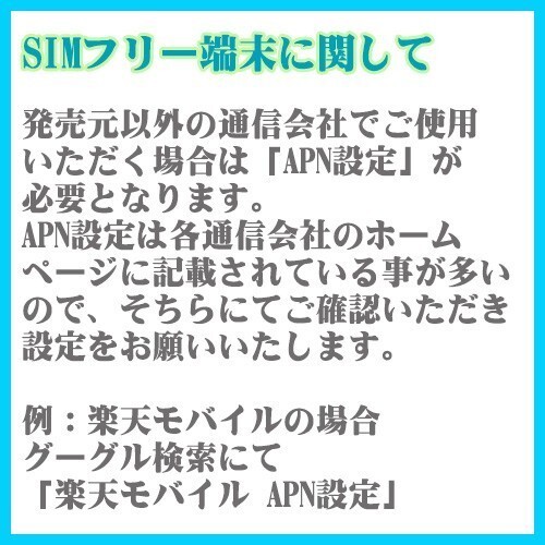 | ・SIMフリー(SIMロック解除)端末の各通信会社での使用の可否に関しては、ご契約の通信会社の方へご確認くださいませ。 ※当店の商品は、SIMフリー(SIMロック解除)端末であっても、あくまで元の通信キャリアでの動作を保証するものとなります。ご購入後にご契約の通信会社が対応していなかった等の理由での返品は受け付けておりませんので、事前にご契約の通信会社の方へ確認をお願いいたします。 ・SIMフリー(SIMロック解除)端末は使用前に「APN設定」が必要となります。(インターネットのプロバイダ設定のようなもの) ※APN設定の方法は各通信会社のホームページに記載がございます。 例)インターネット検索にて「LINEmobile APN設定」等のワード検索にて検索可能です。 | ||||||