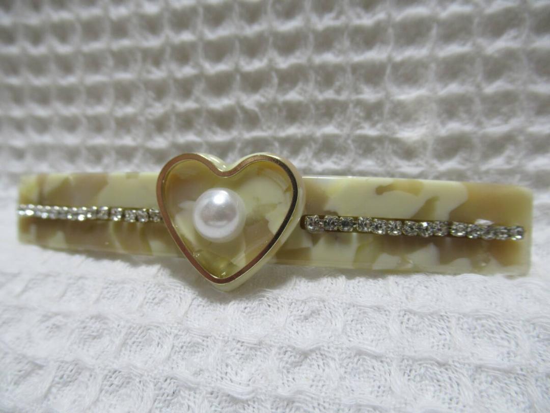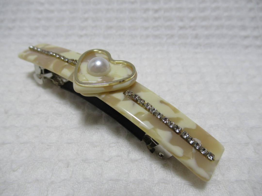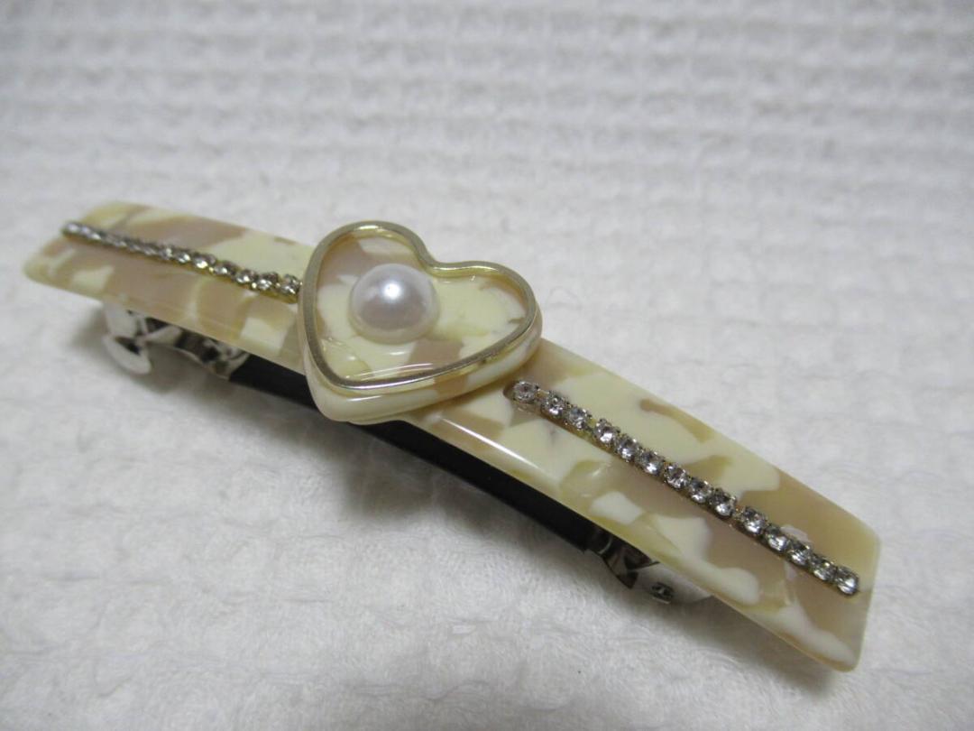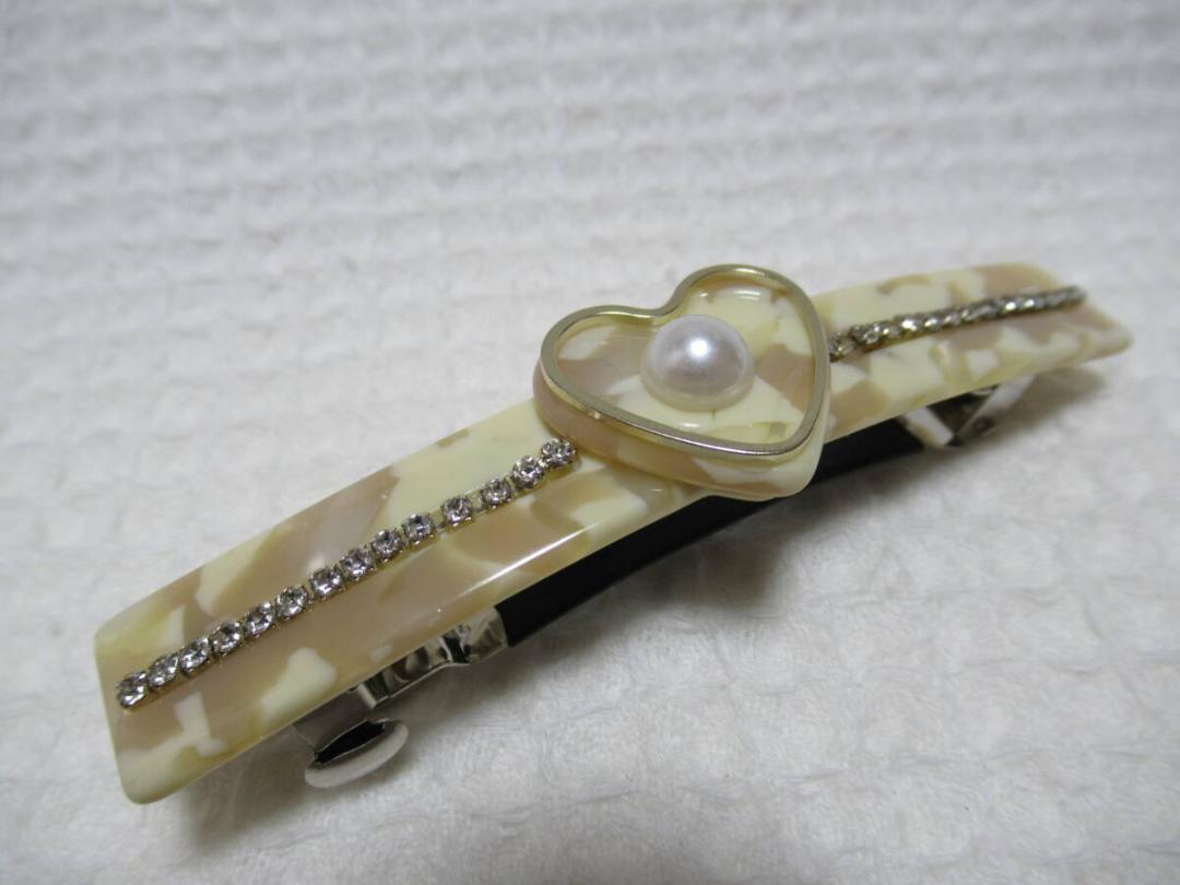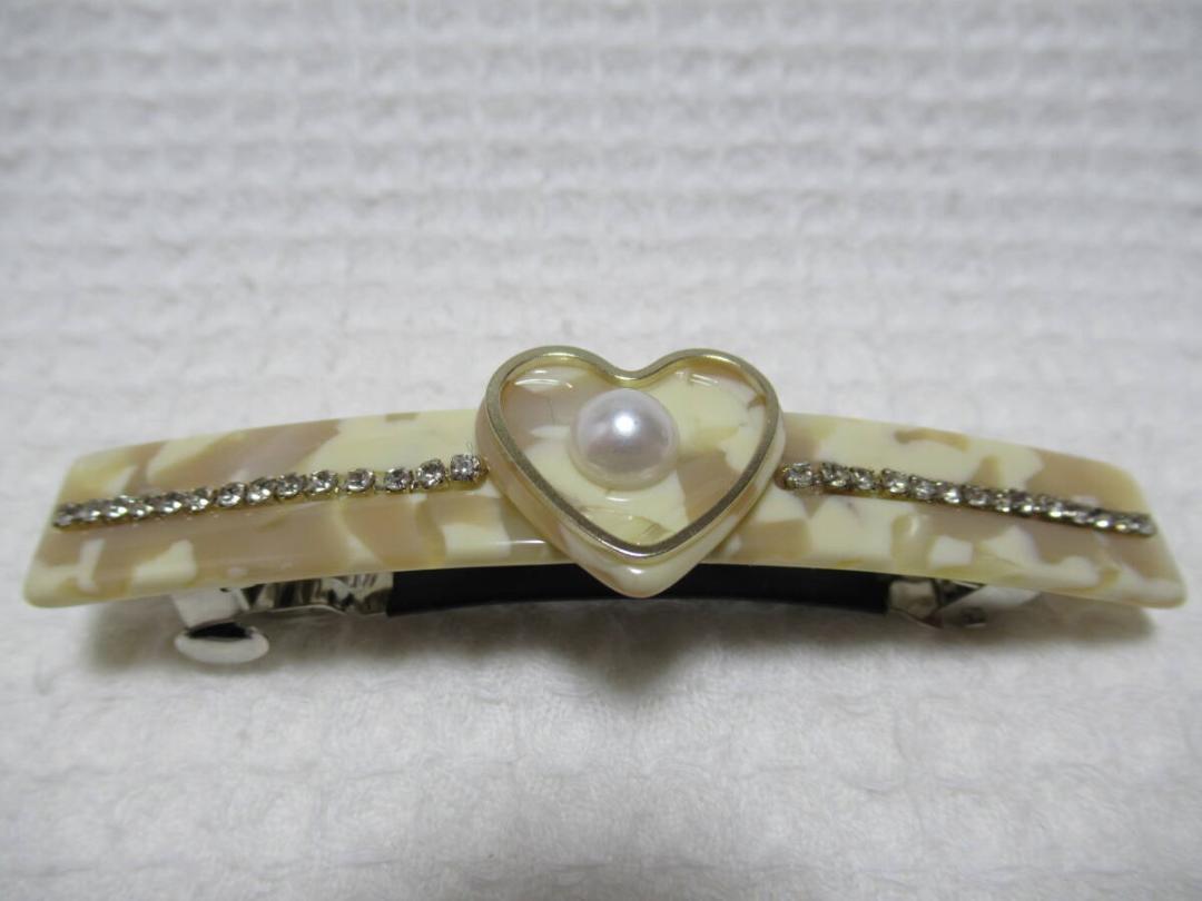 パールの半球型付きのハート型・ラインストーン付き シルバー色メタルバレッタ ベージュ系の濃淡