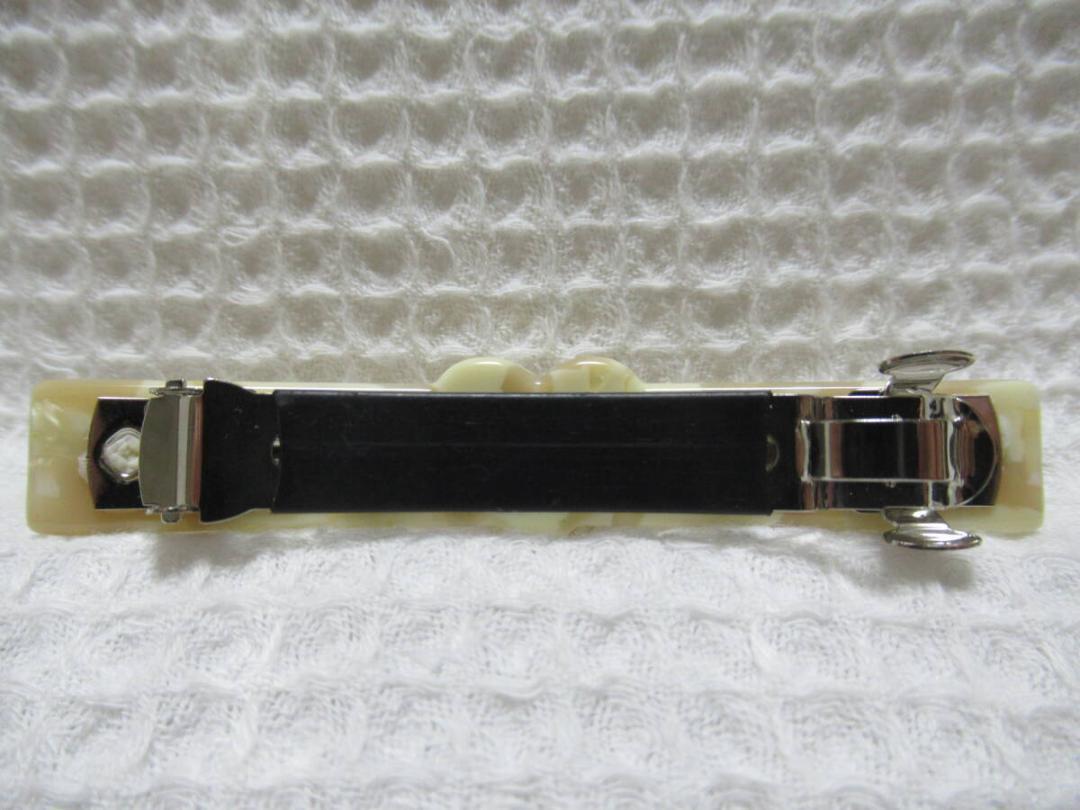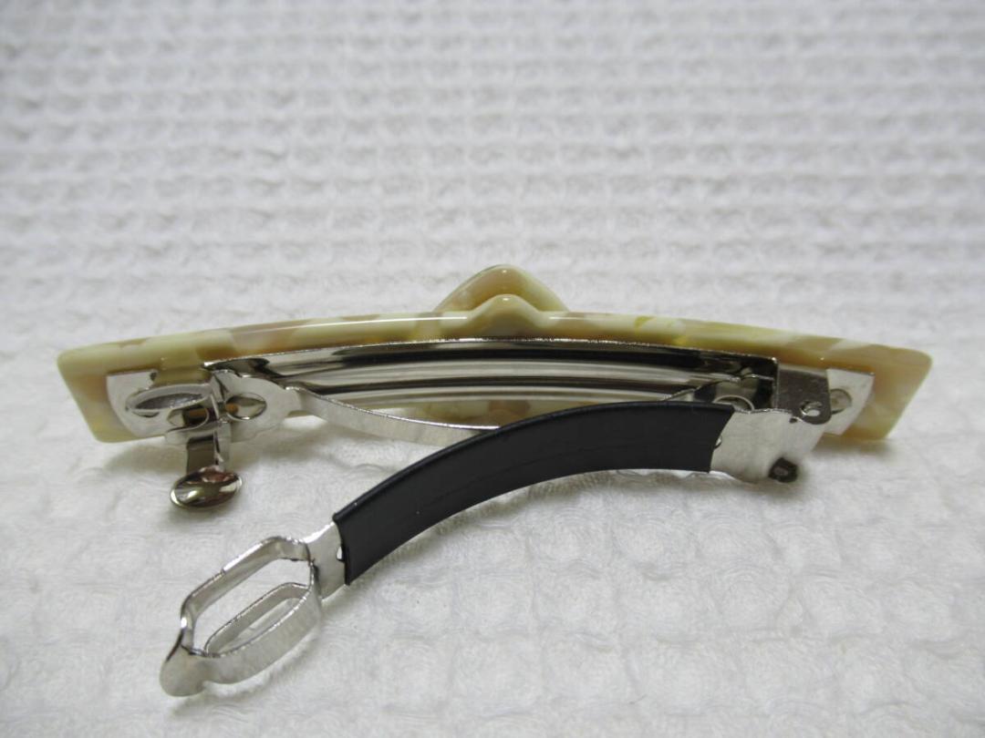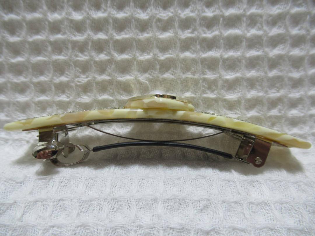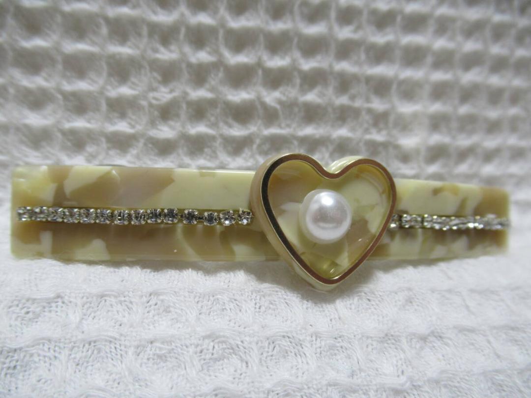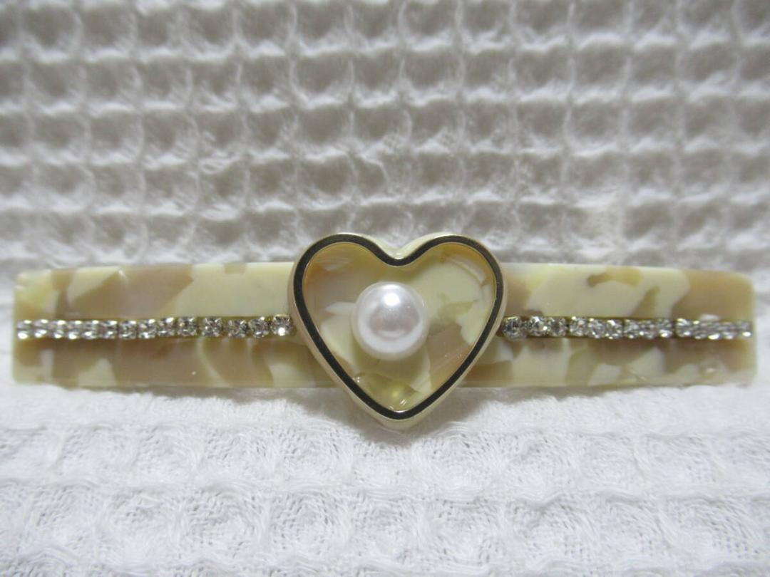 パールの半球型付きのハート型・ラインストーン付き シルバー色メタルバレッタ ベージュ系の濃淡