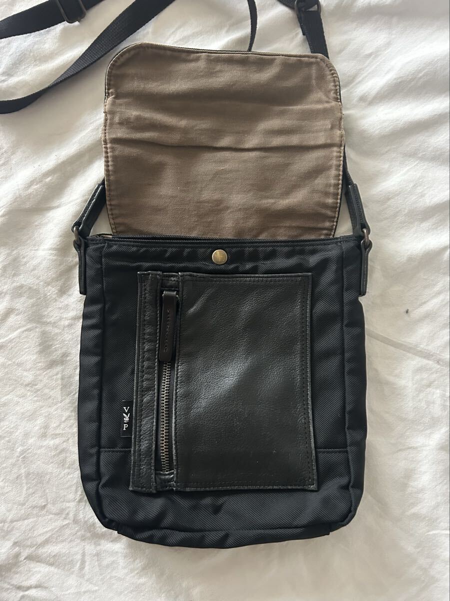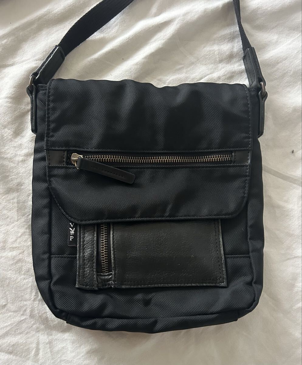 VPナイロン、合成革製のブラックショルダーバッグ、調整可能なストラップと3つのポケット付き。