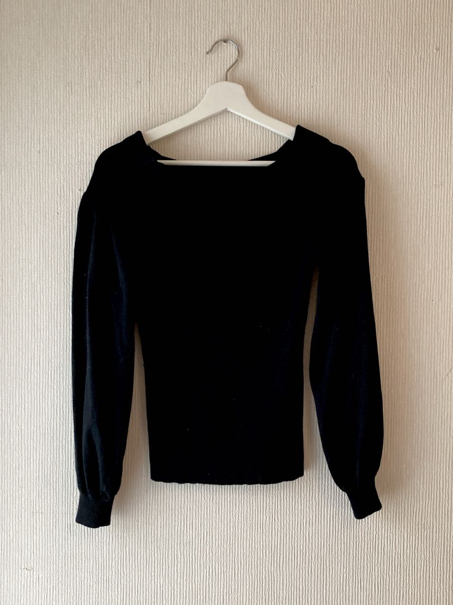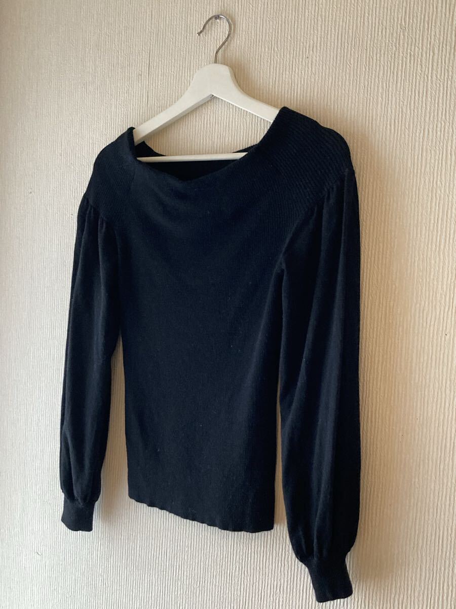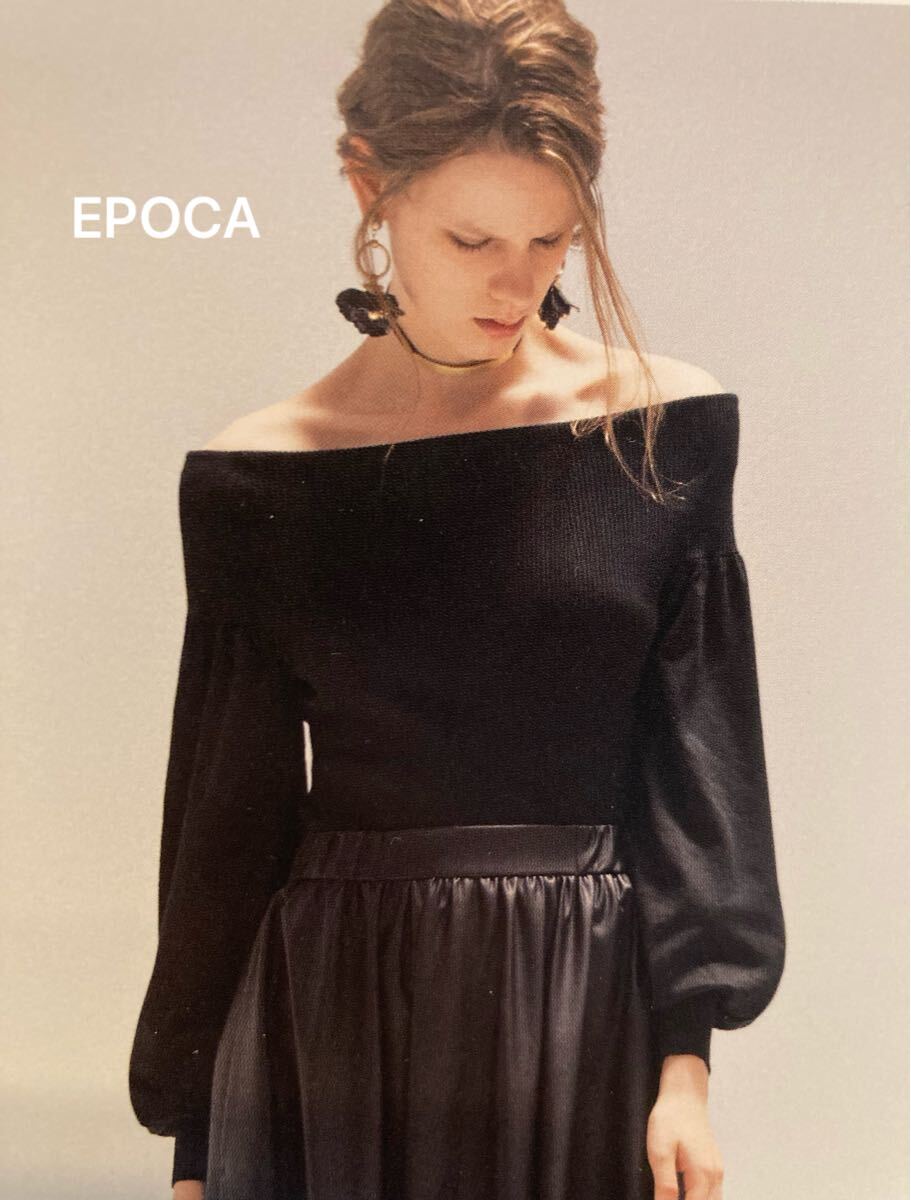 襟ぐりを伸ばすと写真のようなオフショルダーになります。ニットですので伸縮性があり、普通に肩を出さずにもご着用できます。
