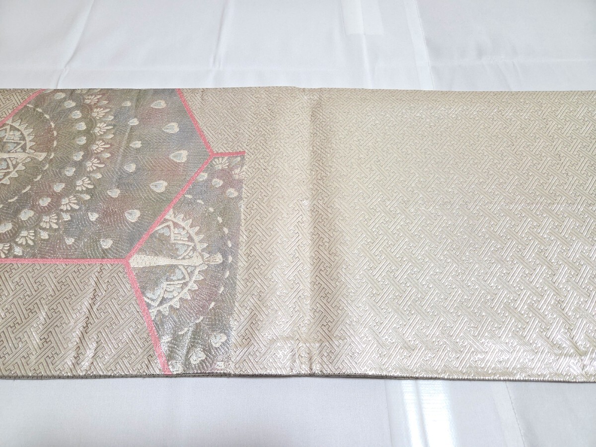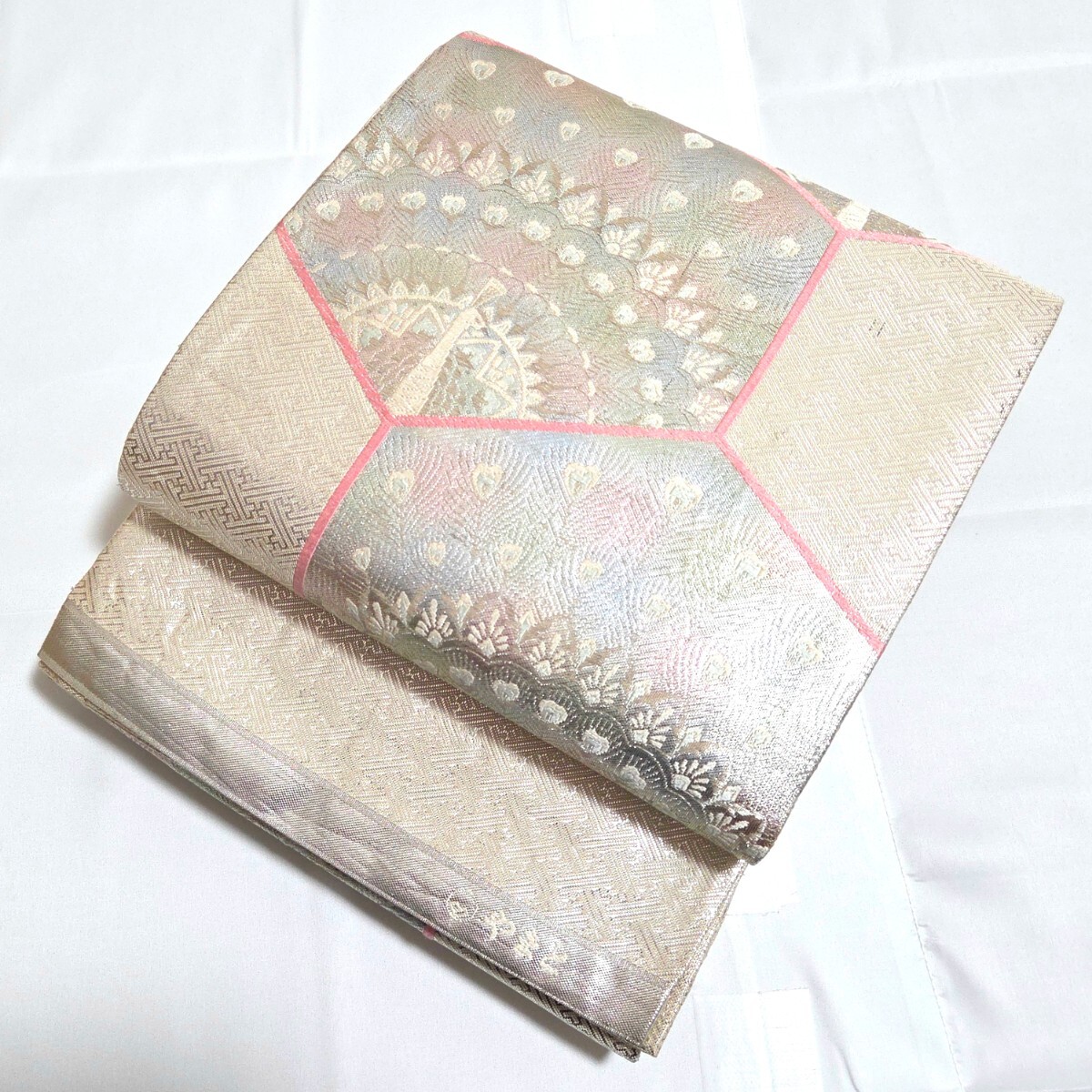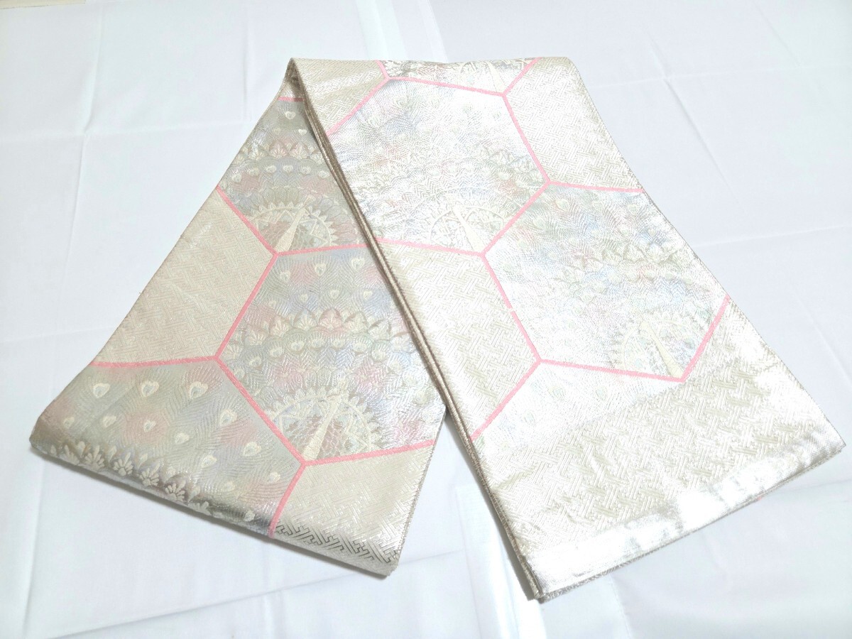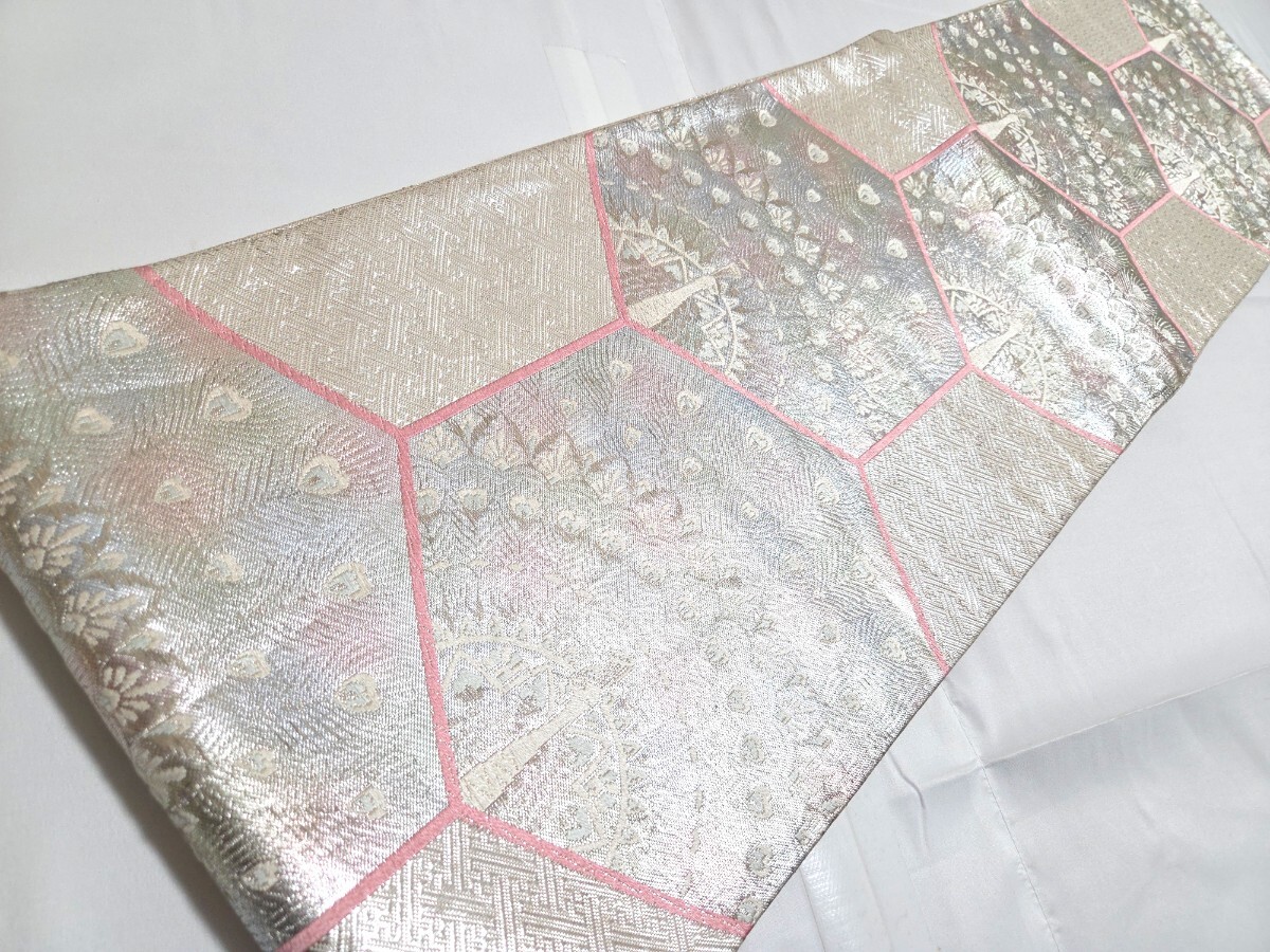 こちらは、やまと 亀甲孔雀文 銀糸 パステル 紗綾形 六通 正絹 フォーマルな袋帯になります。