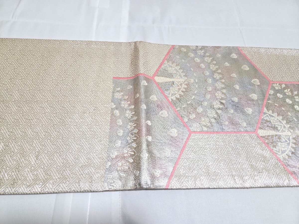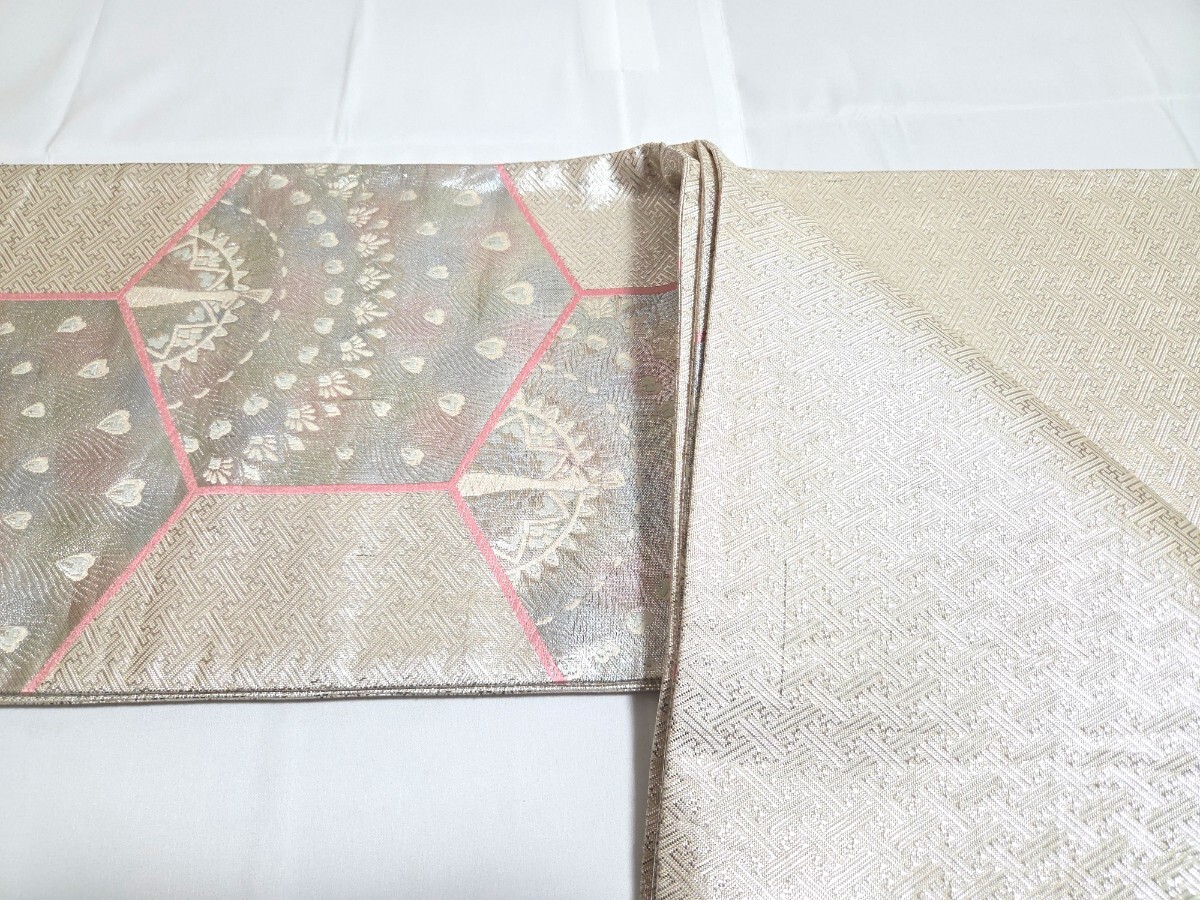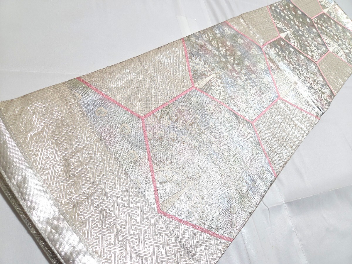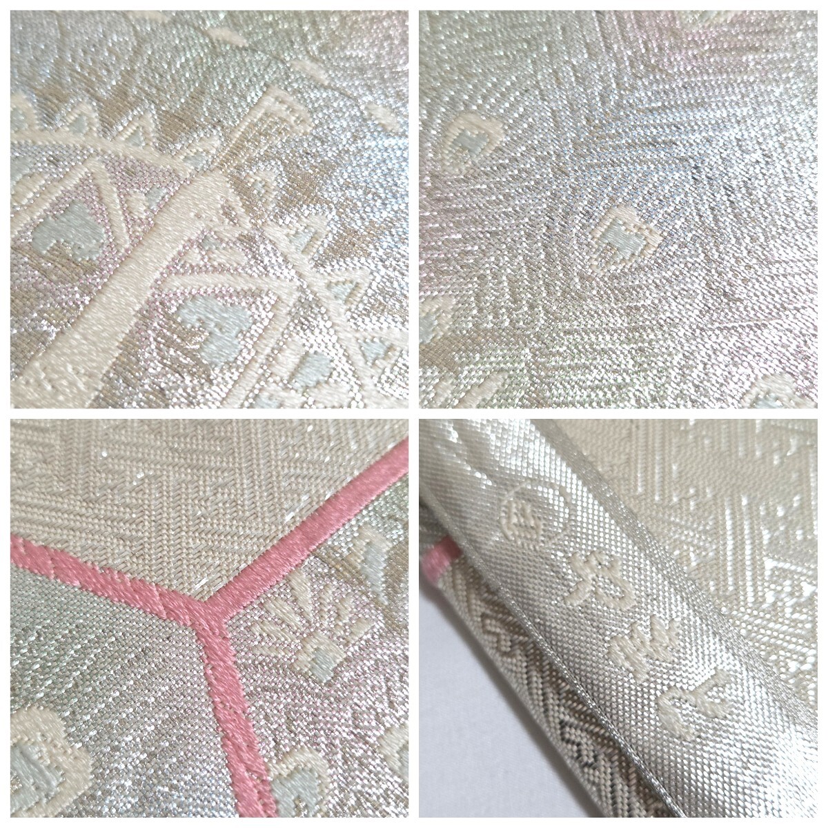 こちらは、やまと 亀甲孔雀文 銀糸 パステル 紗綾形 六通 正絹 フォーマルな袋帯になります。
