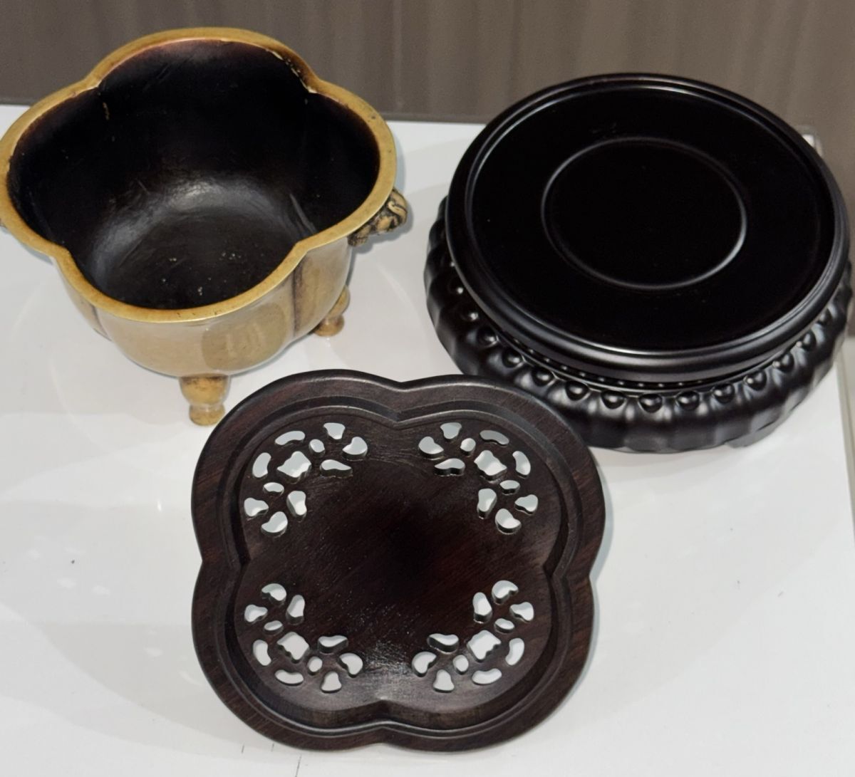 永し 明時代 宣德年製 黄銅製 海棠獅耳爐 紫檀蓋座 玉石鈕 極細工 古銅彫 置物擺件 古美術品 時代物 古董品 収集古美味 旧家蔵出 中国唐物