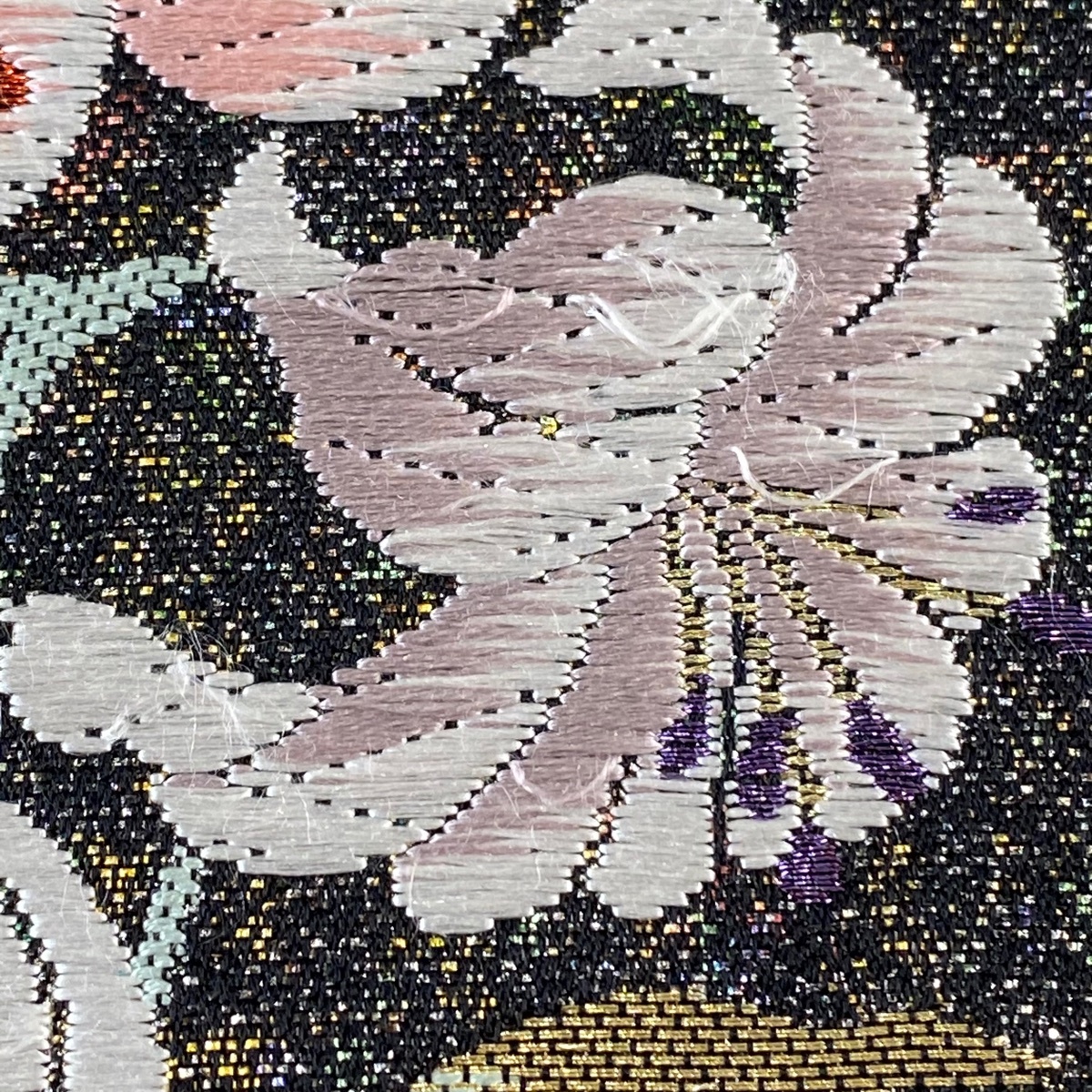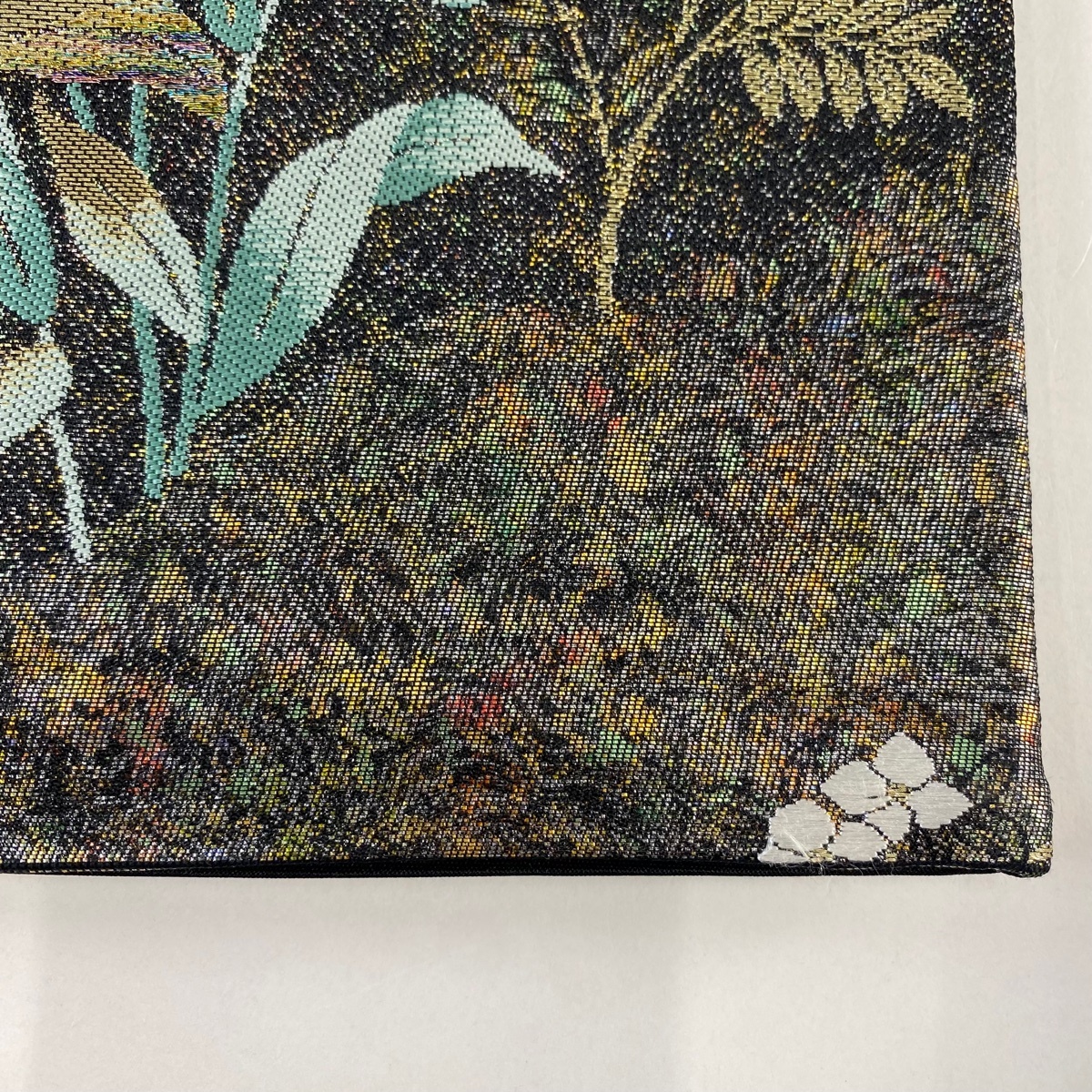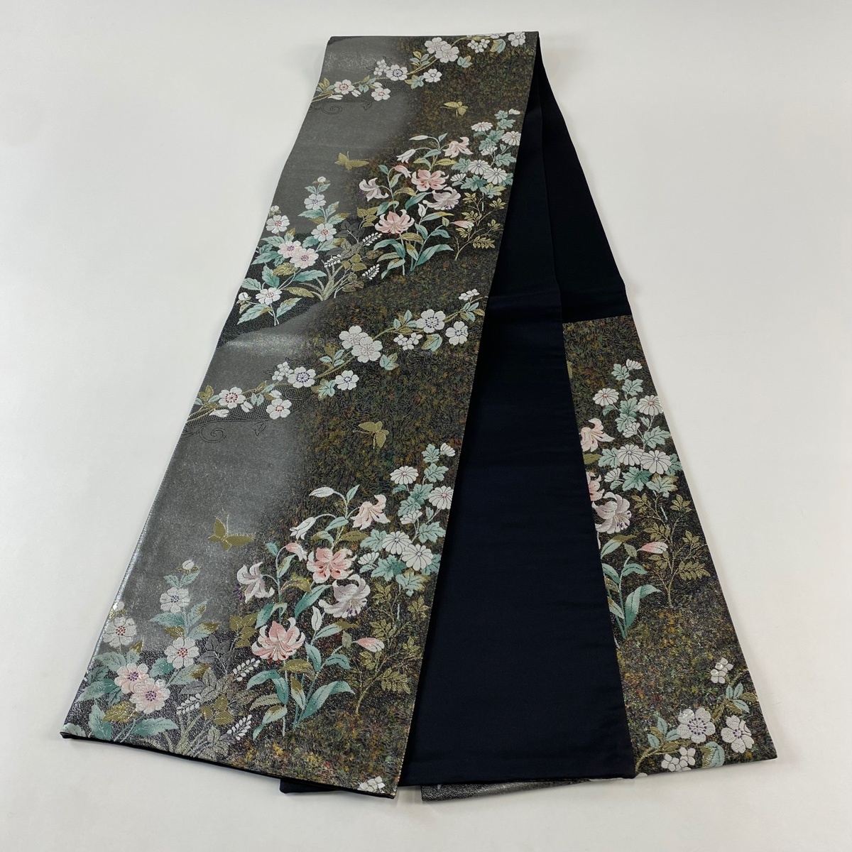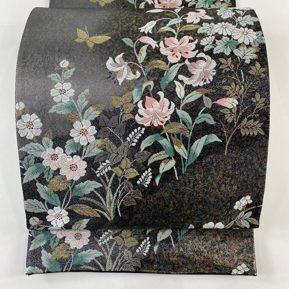 | 袋帯 秀品 草花 蝶 刺繍 金糸 黒 六通 正絹 【中古】 |