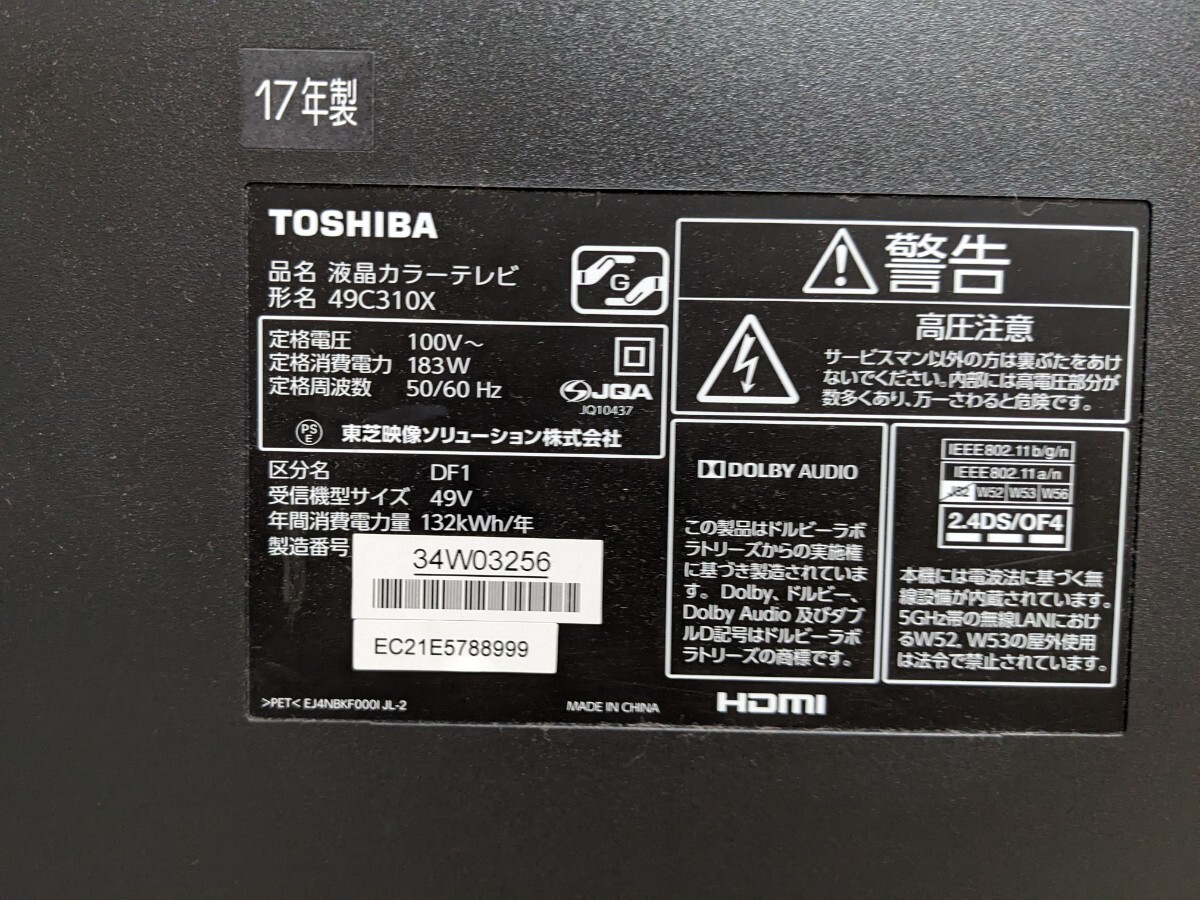 TOSHIBA REGZA 液晶カラーテレビ 49C310X 4K 東芝 17年製