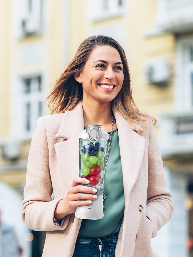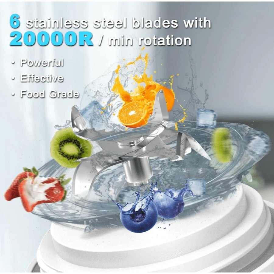 使い方は簡単、ボタンを押すだけで、鋭い切れ味と耐久性の高い立体的なステンレス製6枚刃で、30秒ぐらいで滑らかで細かな口当たりができるジュース・スムージーが出来上がります。150Wハイパワーモーターを搭載しており、最大22000回/分の回転数、野菜や果物はもちろん、氷や冷凍物など硬い食材をあっという間にスムージーな液状になっております。