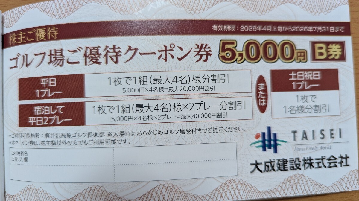 大成建設株主優待 ゴルフ優待クーポン券5000円 有効期限:2026年4月上旬から2026年7月31日 1枚