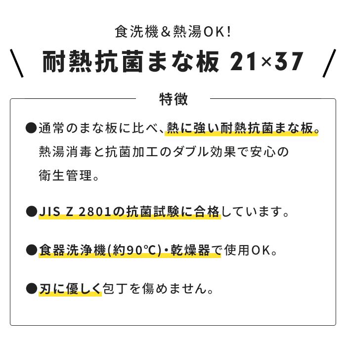 | 通常のまな板に比べ、熱に強い耐熱抗菌まな板。 熱湯消毒と抗菌加工のダブル効果で安心の衛生管理。 JIS Z 2801の抗菌試験に合格しています。 食器洗浄機(約90℃)・乾燥器で使用OK。 刃に優しく包丁を傷めません。 |