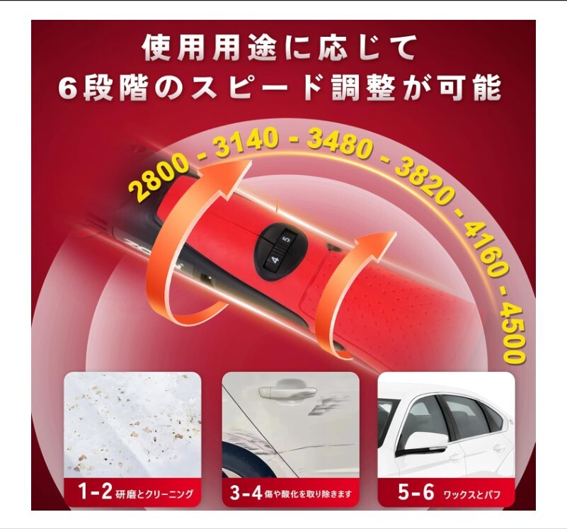 【六段階可変速度制御】 六段の回転数2800~4500rpmを簡単に調整可能:低速(2800-3200rpm)は繊細な塗装面の修復に適し、中速(3300-3800rpm)は通常のポリッシングに対応し、高速(3900-4500rpm)はプロフェッショナルレベルの鏡面処理を実現します。