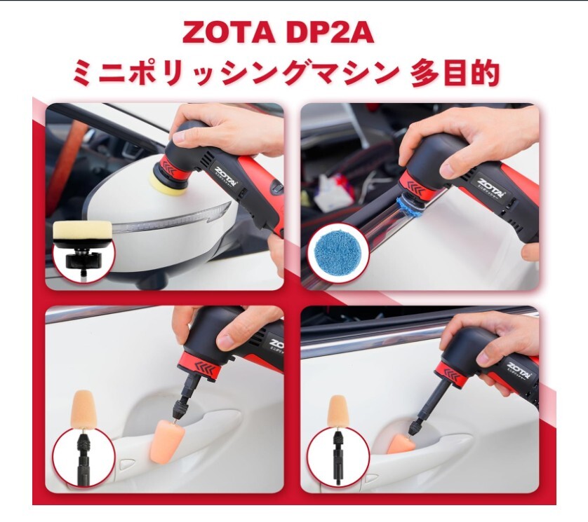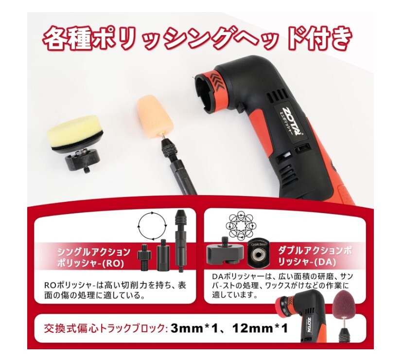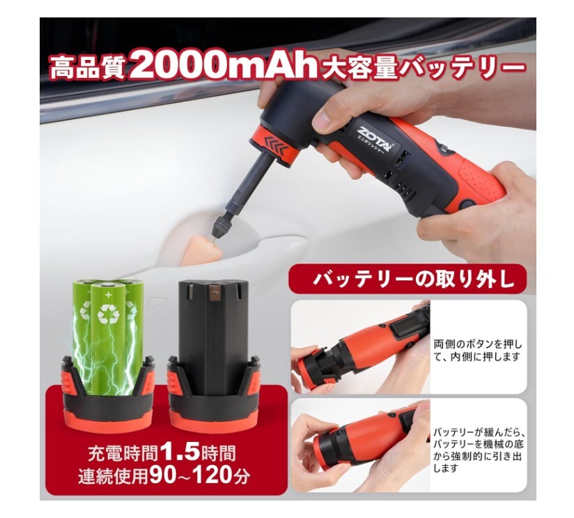 【豊富な付属品】ZOTA電動ポリッシャー 付属品が豊富で充実しており、12Vバッテリー2個+各種ポリッシングパッド+交換用パーツが同梱。フルセット装備と日本語取扱説明書付きで、開封後すぐに使用可能。専用収納ケース付きで携帯に便利。