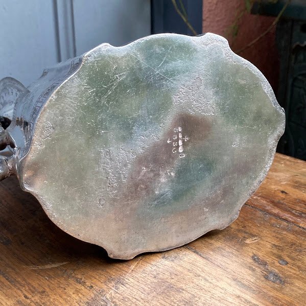 繊細で美しい模様が刻まれたティーポットが届きました。側面に大きな傷もなくたたずむ様子は、長く大切に使われていたことを物語っています。底に刻印と数字が刻まれていますが、一部消えかかっているため判別はできませんでした。内側は若干の使用感がありました。イギリス製、年代不詳。光に反射してきらめく様子は、お部屋に彩りを添えてくれることでしょう。福岡市南区の店舗にてお渡しもできますのでお気軽にどうぞ!