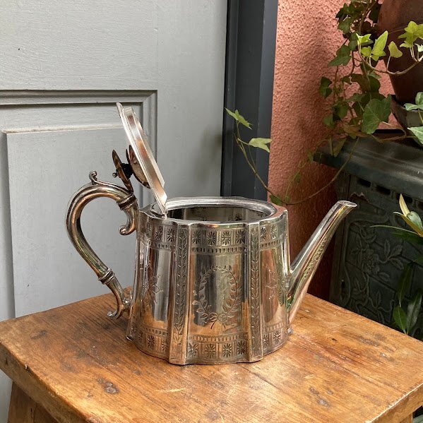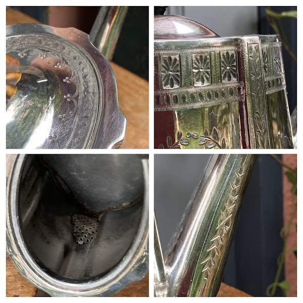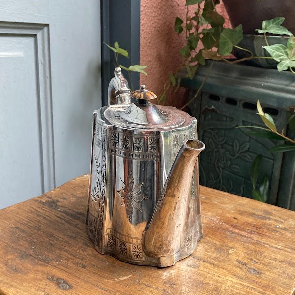 繊細で美しい模様が刻まれたティーポットが届きました。側面に大きな傷もなくたたずむ様子は、長く大切に使われていたことを物語っています。底に刻印と数字が刻まれていますが、一部消えかかっているため判別はできませんでした。内側は若干の使用感がありました。イギリス製、年代不詳。光に反射してきらめく様子は、お部屋に彩りを添えてくれることでしょう。福岡市南区の店舗にてお渡しもできますのでお気軽にどうぞ!