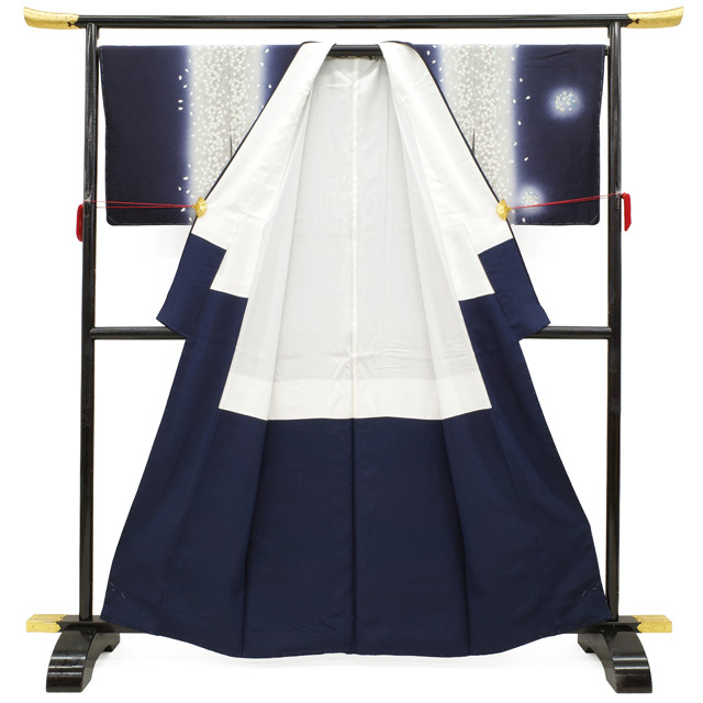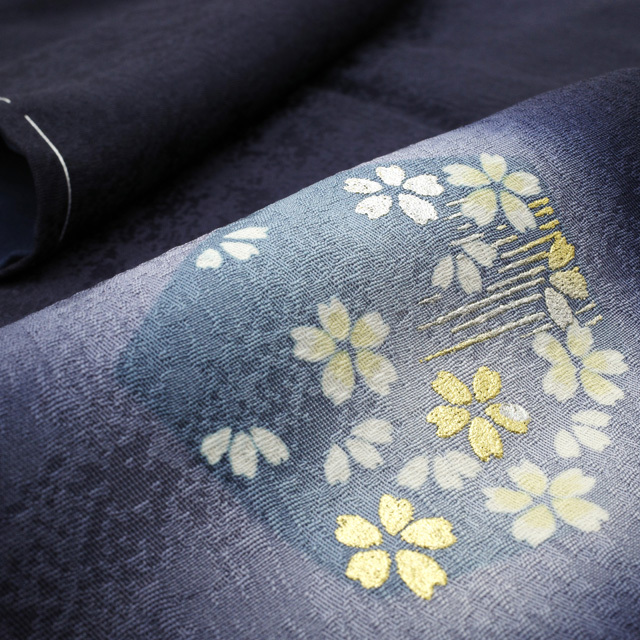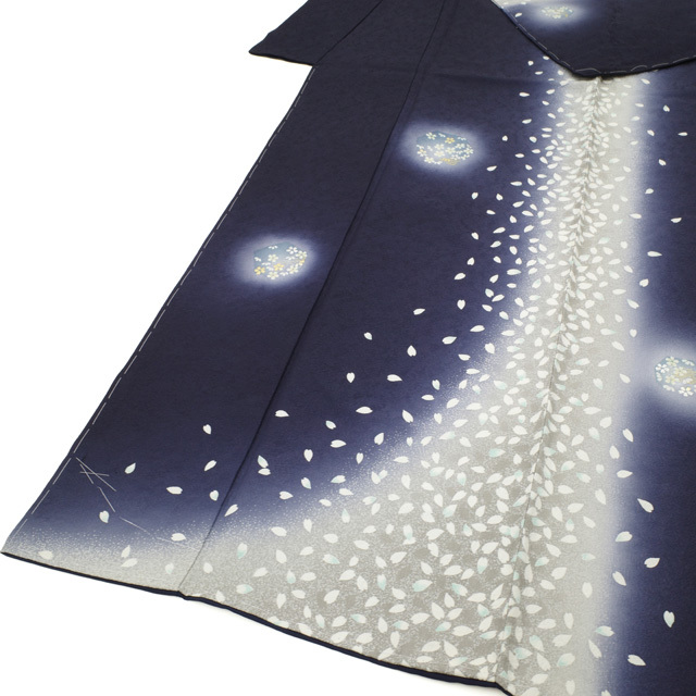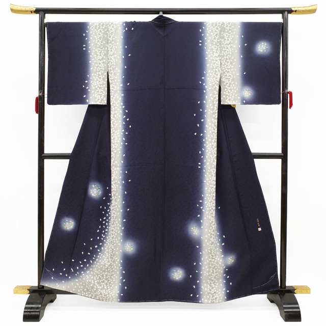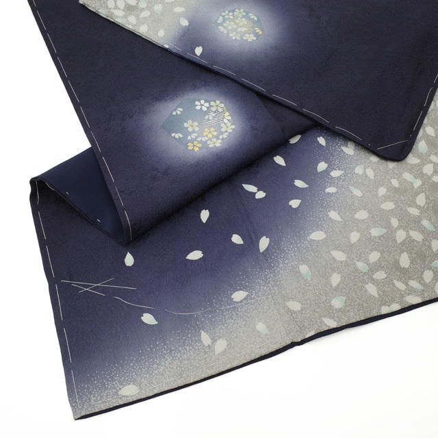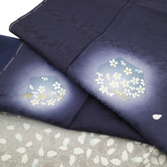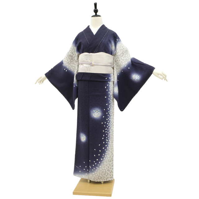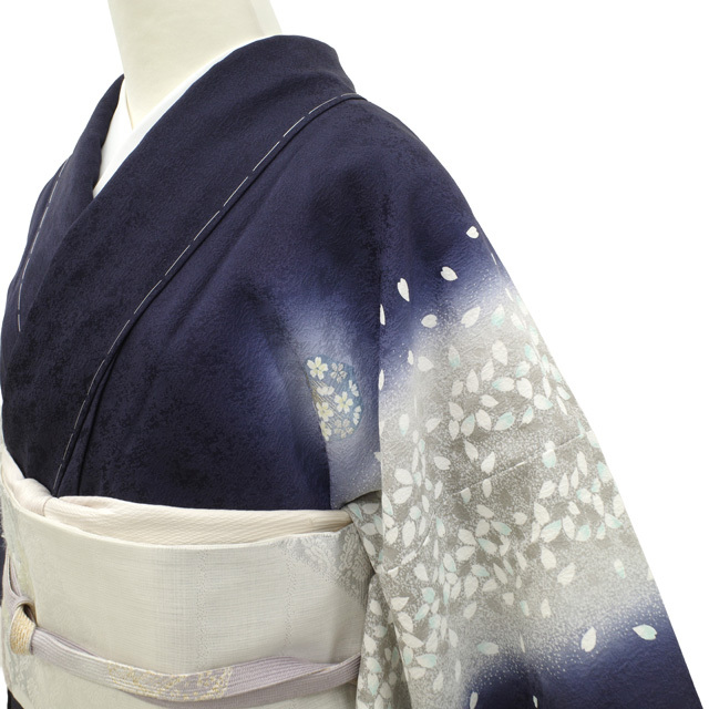 こちらのお品は、深みのある濃紺地をベースに、脇線沿いと裾へと流れるように淡いライトグレーのぼかしが施された上品な一枚。