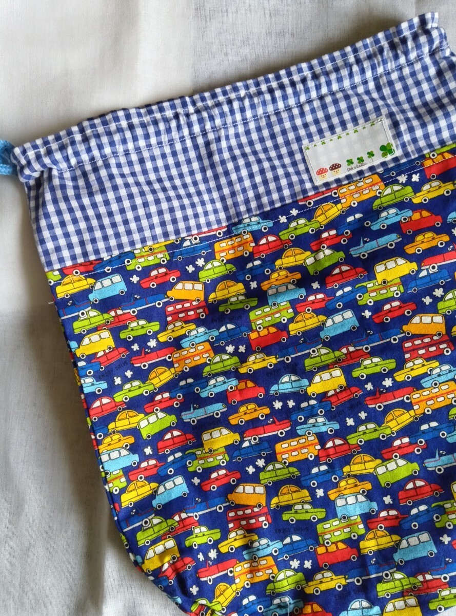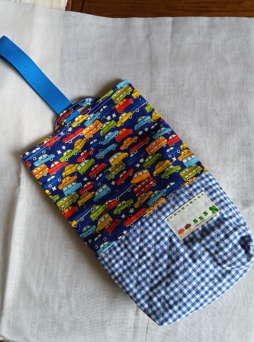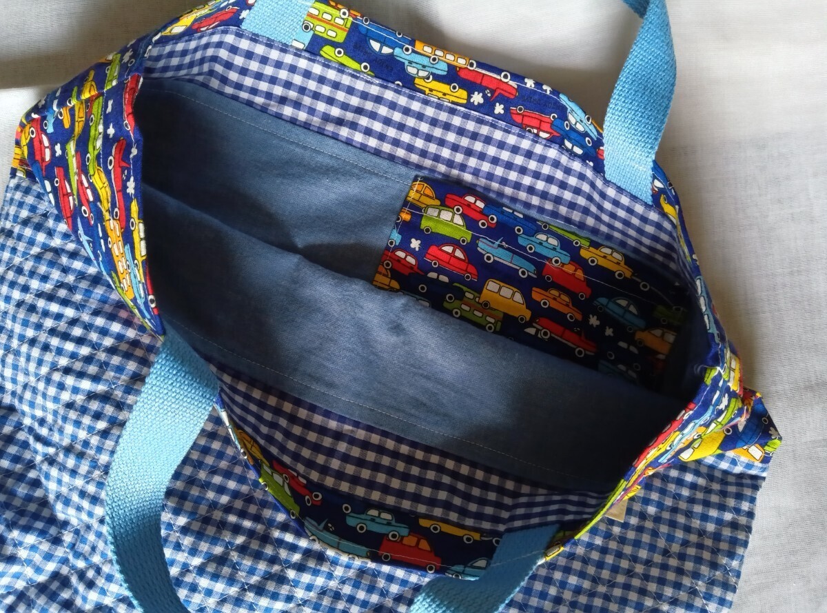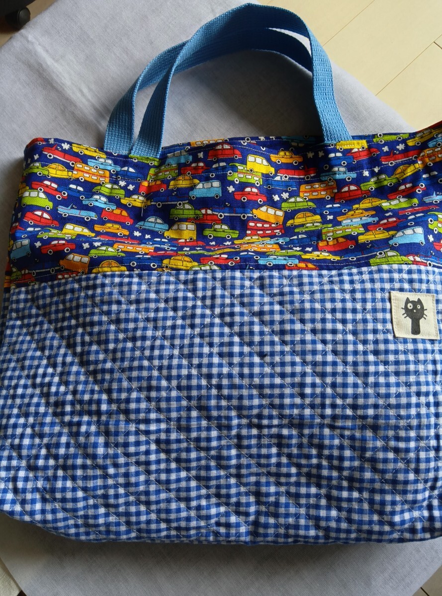 ブルーのキルティングとクルマ・くるま・車の生地でしっかり出来てます。