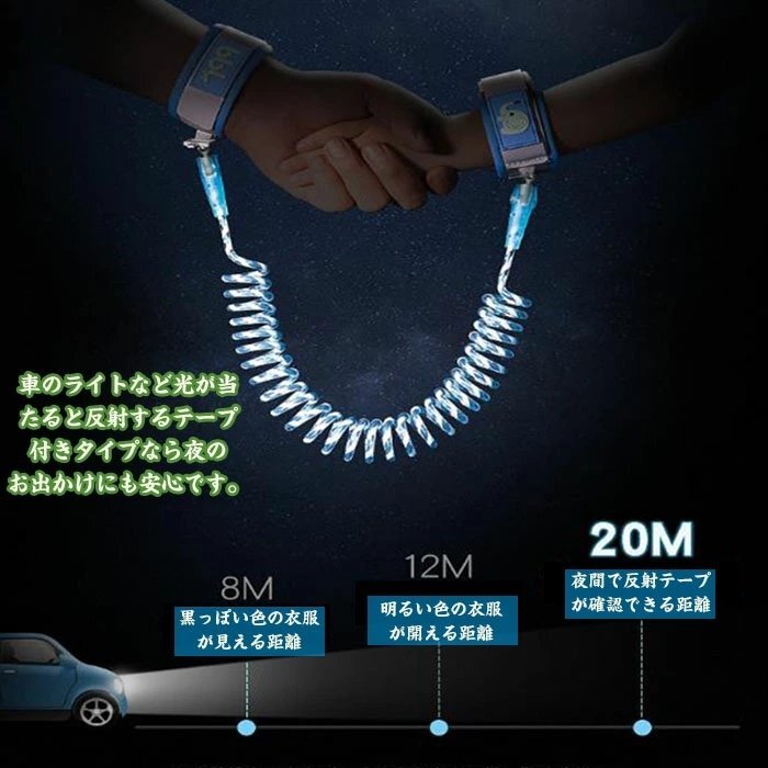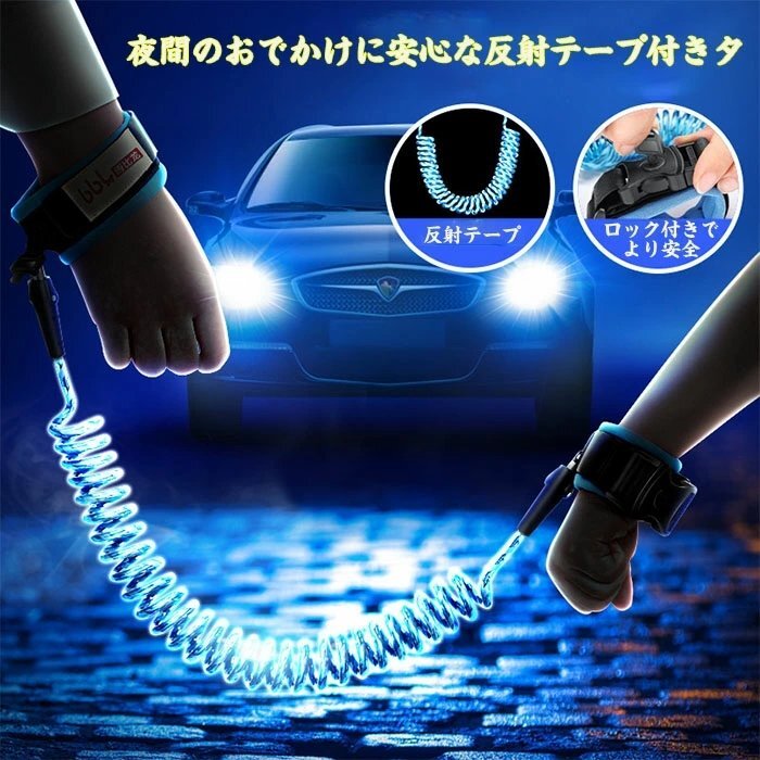 迷子防止ハーネス 安全ロック付き 子供の反失われた手首のリンク縄 伸縮可能 ナイトビジョン反射ストリップ1.5m☆3色選択/1点