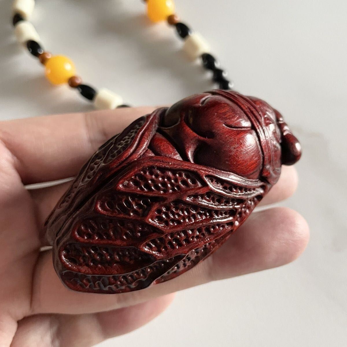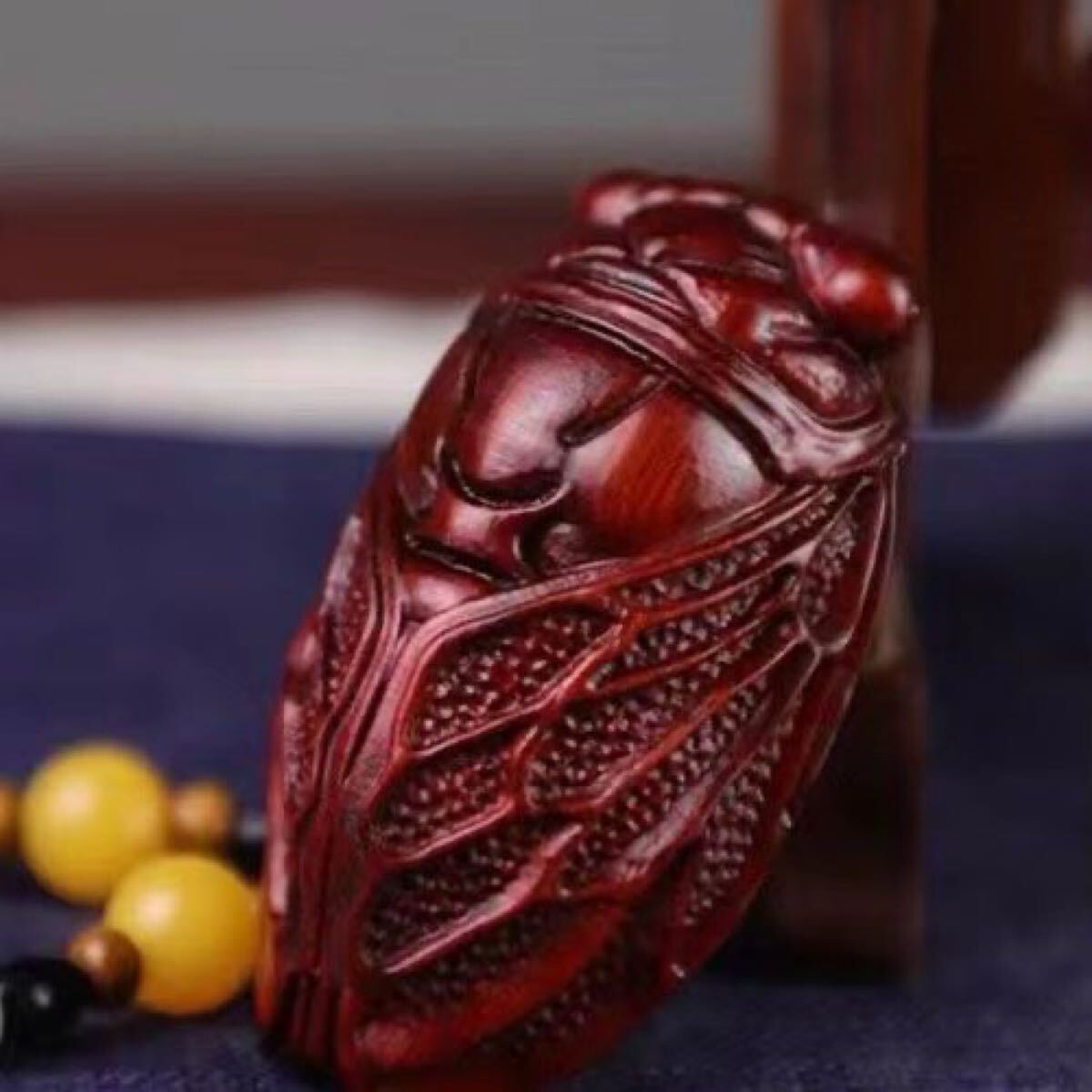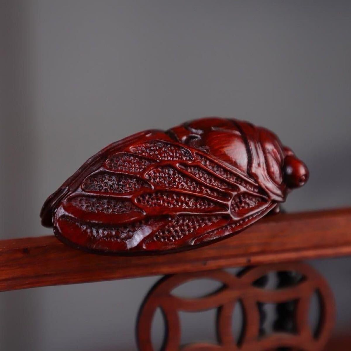 送料無料 紫檀木彫り 蝉 セミ 根付 ストラップ 高さ約7cm 古美術 縁起物 置物 提物