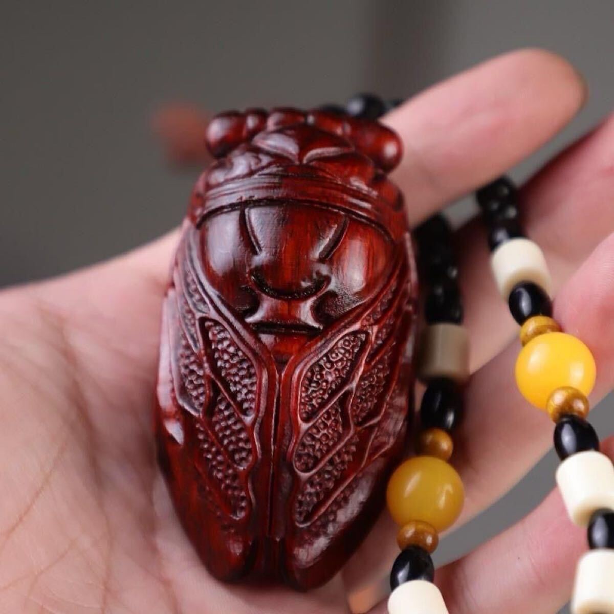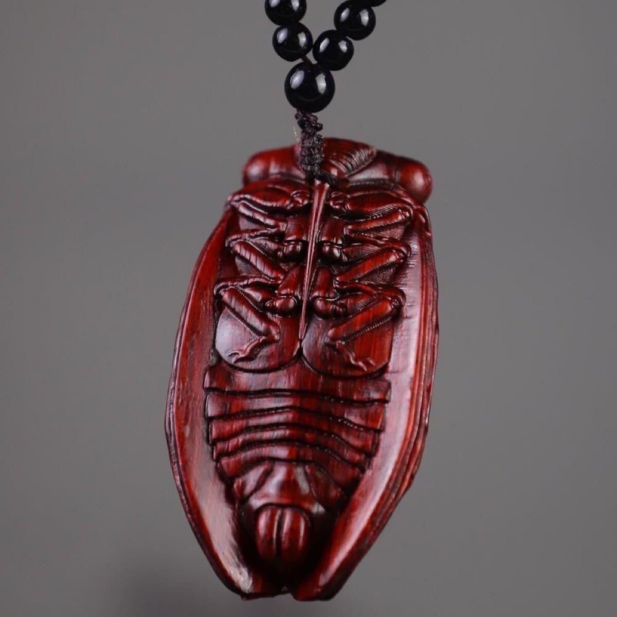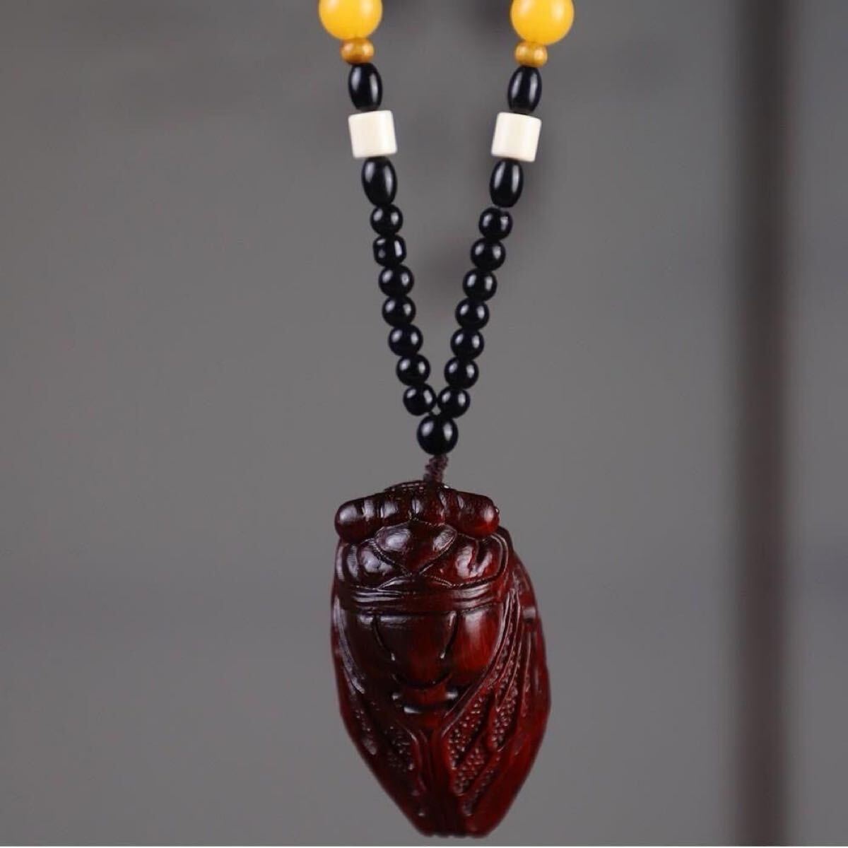 送料無料 紫檀木彫り 蝉 セミ 根付 ストラップ 高さ約7cm 古美術 縁起物 置物 提物