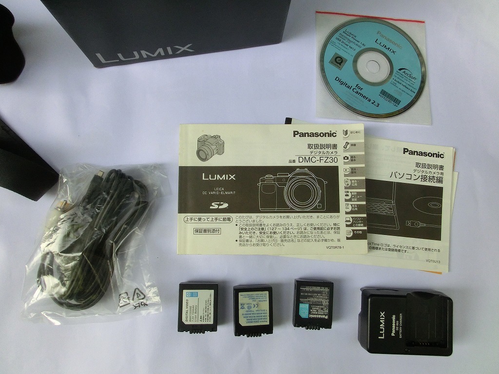 本体、取説、レンズフード、レンズキャップ、AVケーブル、USBケーブル、充電器、純正バッテリー×1個、社外バッテリー×2個、CD-ROM、外箱、以上があります。