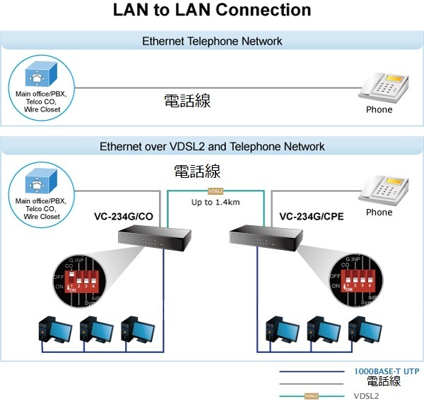 | 商品説明 | 電話線でLAN 最長 1.4Km LANの信号を2芯電話線に変換1400mまで延長 高速通信VDSL2コンバーター ITU-T G.993.5G.VectorおよびG.INP DMTベースのコーディングテクノロジー 音声と日付を共有するための内蔵POSTスプリッター VDSL接続のVDSLポート用の1つのRJ11コネクタ 電話接続用の1つの電話コネクタ 既存の電話回線に基づいて、音声通信とデータ通信を同時に共有できます DIPスイッチで選択可能なCO / CPEモード 選択可能なターゲットバンドプランとSNRマージン 最大200 / 100Mbps(G.INP、Asym、8dB)帯域幅 4つの10/100 / 1000BASE-TXLANポート IEEE 802.3、10BASE-T、IEEE 802.3u、100BASE-TX、およびIEEE 802.3x、フロー制御イーサネット標準に準拠 半二重背圧とIEEE802.3x全二重ポーズフレームフロー制御 IEEE 802.1QVLANタグの透過性をサポート シンプルなブリッジモデムアプリケーション用のVDSL2スタンドアロントランシーバ 最小インストール時間の利点(単にプラグアンドプレイ) ネットワーク診断用の広範なLEDインジケータをサポート コンパクトなサイズで設置が簡単 VC-231G VC-231GP VC-234G |