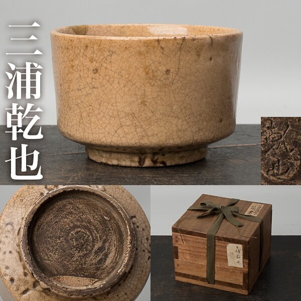 | 三浦乾也の筒茶碗。合箱有。 「天禄堂 乾也」の刻銘有。天禄堂は三浦乾也の号です。 乾也は六代乾山と言われることもあり(本人は名乗っていない)、乾山風の 作品も多いですが、こちらの茶碗は絵付けは無く、素朴な作風です。 サイズは、幅約11.5cm、高さ約8cm。 くちに直しがあります。 くちからニュウがあります。 合箱が浅く、茶碗を伏せて入れないと、箱の蓋がきちんと閉まりません。 状態、詳細は画像でご確認ください。 |