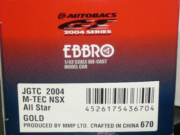 ☆1/43 EBBRO JGTC2004 M-Tech NSX AllStar No.16 金です。箱に少し傷みがありますので、ご了承の上入札下さい。商品の状況は写真でご判断の上、ノ-クレ-ム・ノ-リタ-ンでお願いします。保証はできませんが、定形外郵便での発送も可能です。